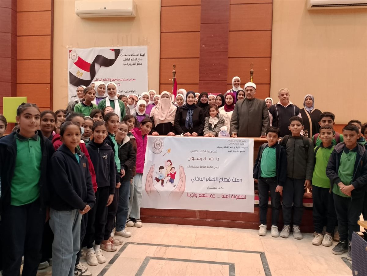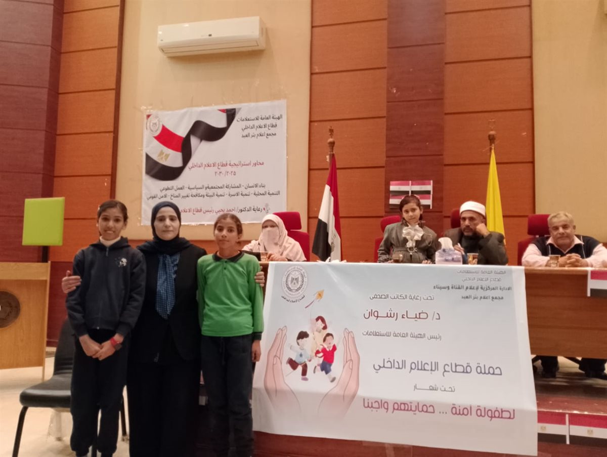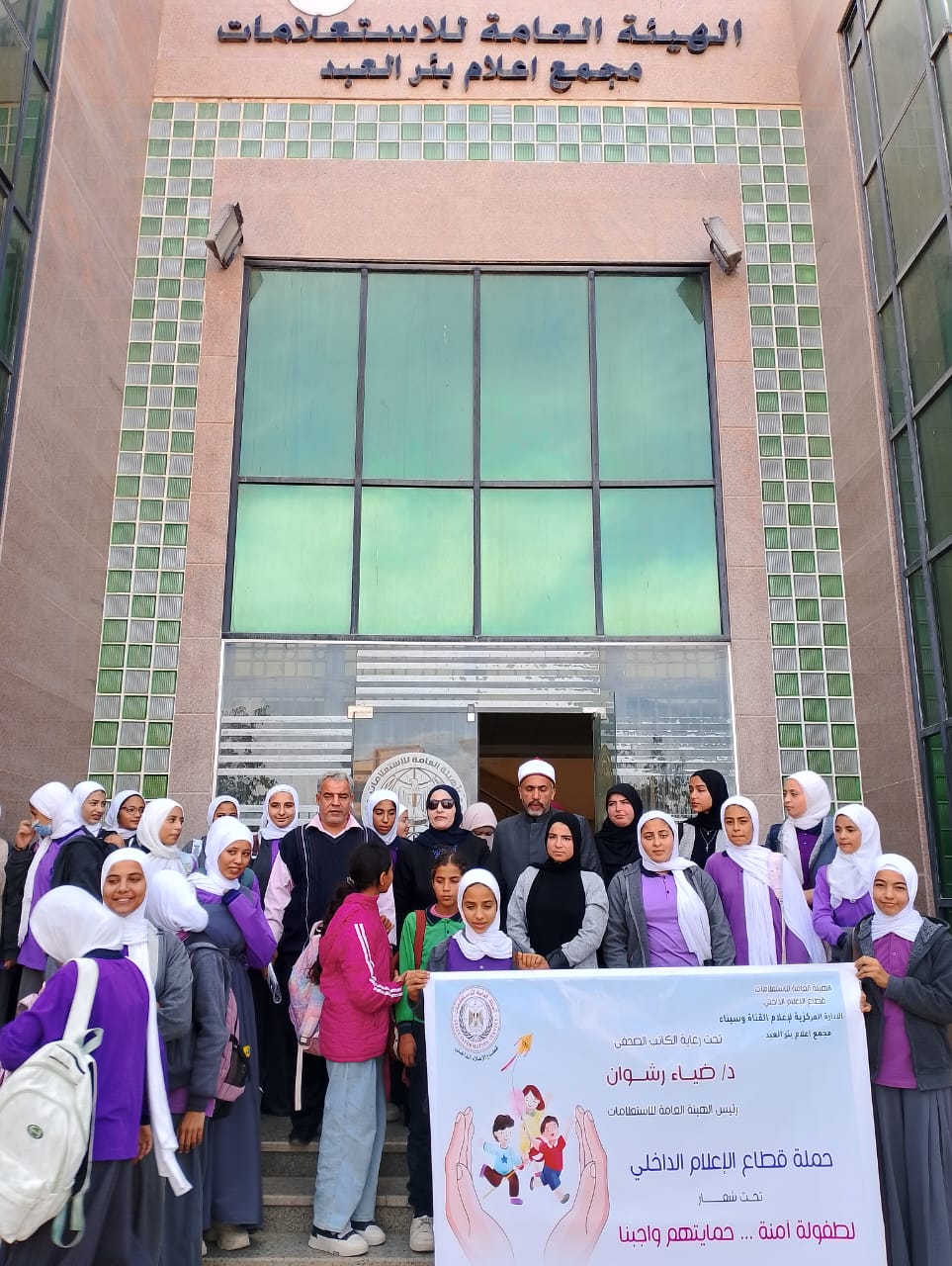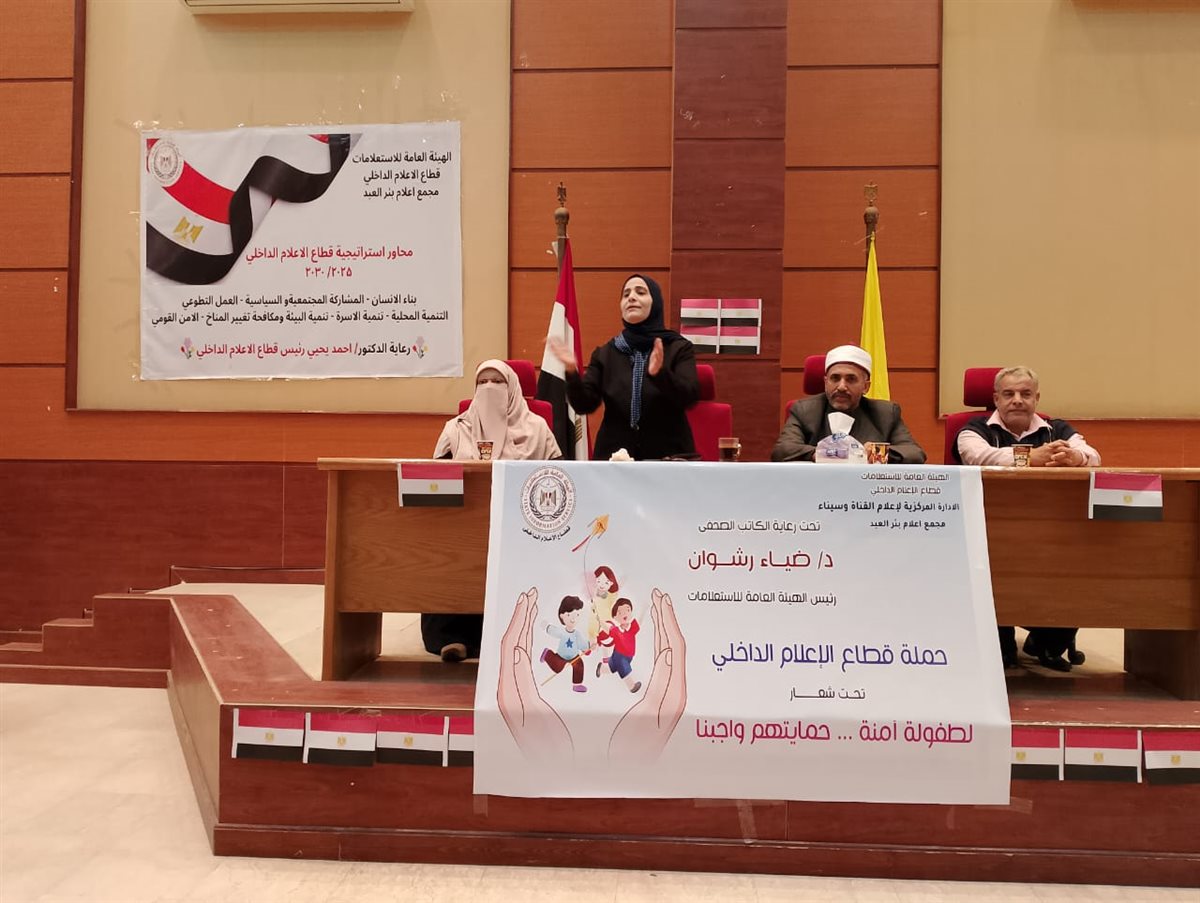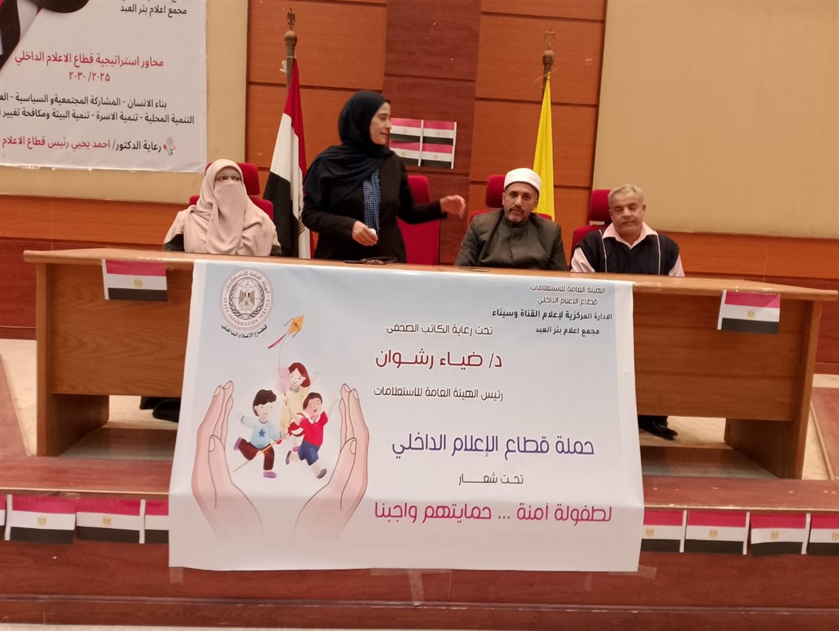 تواصل فعاليات حملة حماية الطفل حضورها المجتمعي في مجمع اعلام بئر العبد بشمال سيناء في اطار حرص الهيئة العامة للاستعلامات على تعزيز الوعي وترسيخ مفهوم رعاية النشء وتنفيذ توجهات الدكتور ضياء رشوان رئيس الهيئة والدكتور احمد يحيى رئيس قطاع الاعلام الداخلي بما يؤكد استمرار الجهود الوطنية الهادفة الى دعم الاسرة وحماية حقوق الصغار من مختلف اشكال المخاطر