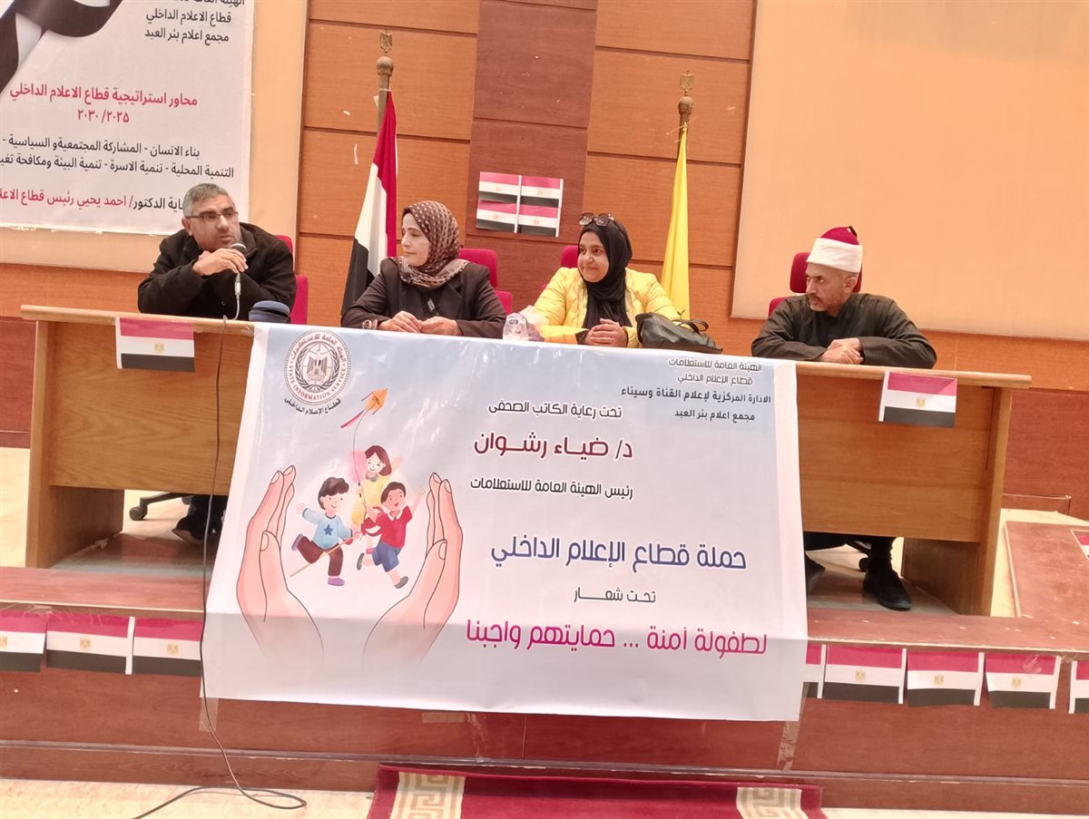 أقام مجمع إعلام بئر العبد ندوة حوارية تثقيفية بقاعة المؤتمرات حول كيفية توفير بيئة اجتماعية وصحية آمنة تحمي أطفالنا من التحرش، برعاية الدكتور ضياء رشوان رئيس الهيئة العامة للاستعلامات وبتوجيهات الدكتور أحمد يحيى رئيس قطاع الإعلام الداخلي.
