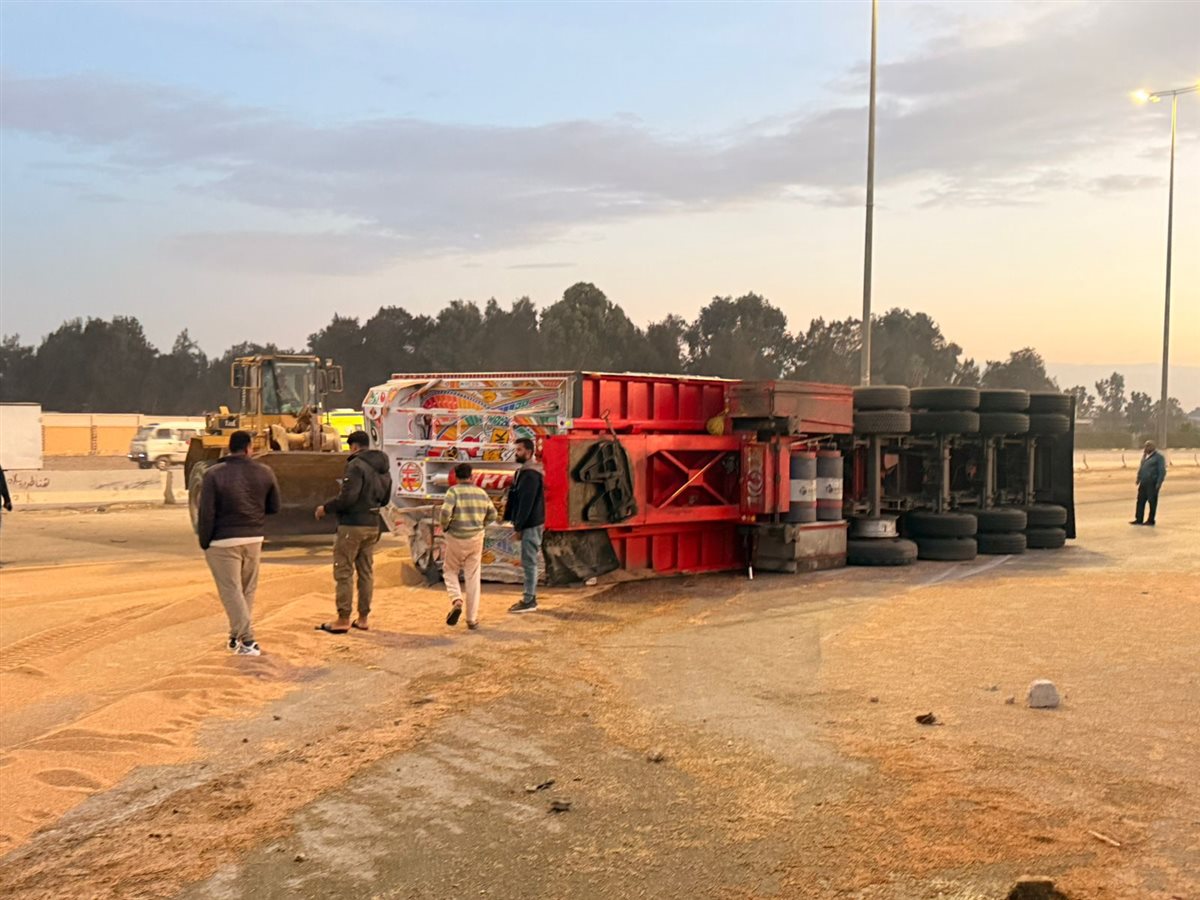 انقلاب ترلة محملة بالغلال على طريق الإسماعيلية القاهرة الصحراوي يسبب إصابة شخصين