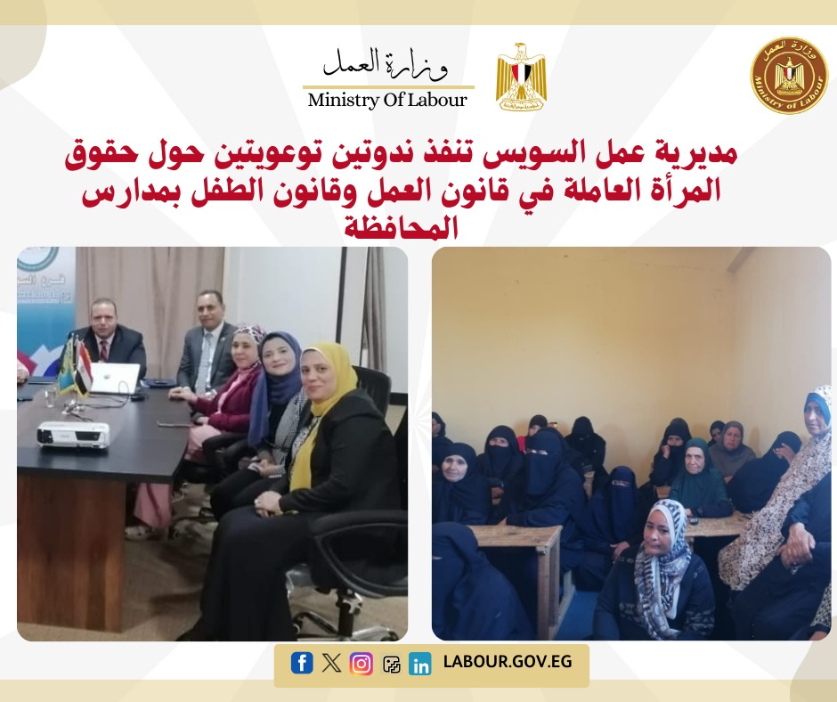 نفذت مديرية العمل بالسويس، ندوتين توعويتين بمدرسة الراعي الصالح ومدرسة الشبان المسلمين، حول حقوق المرأة العاملة في قانون العمل ومستجداته وقانون الطفل.