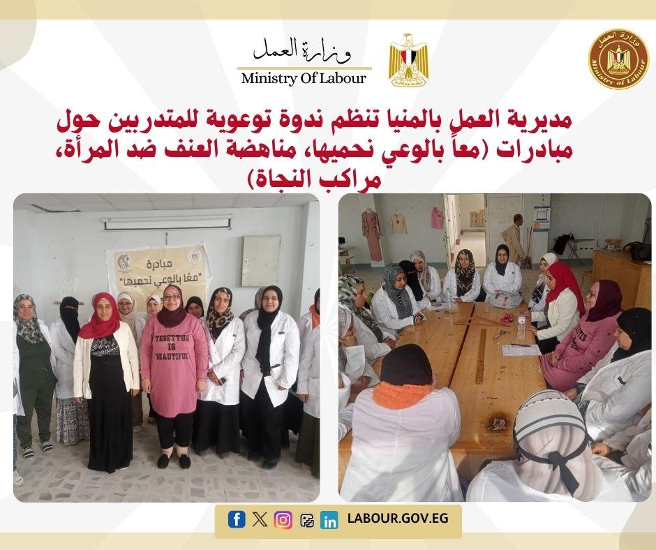 وفي سياق آخر، نظمت مديرية العمل بالمنيا ندوة توعوية للمتدربات والمتدربين في دورات التفصيل والخياطة وصيانة المحمول حول ثلاث مبادرات مجتمعية رئيسية، تحت رعاية وزير العمل ومحافظ المنيا، مبادرة "معاً بالوعي نحميها" ركزت على الترابط الأسري والوحدة الوطنية ومواجهة الشائعات، مبادرة "مناهضة العنف ضد المرأة".
