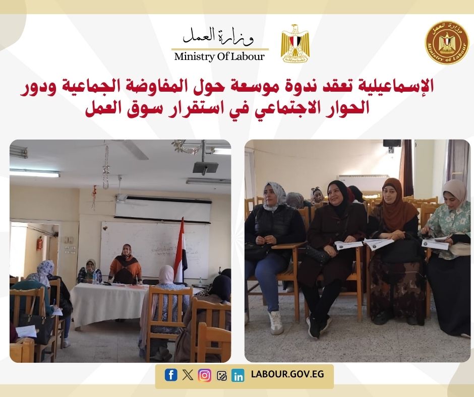 وشهدت مديرية العمل بمحافظة الإسماعيلية ندوة متخصصة حول المفاوضة الجماعية ودورها في تعزيز الاستقرار، بتوجيهات ومتابعة وزير العمل محمد جبران.