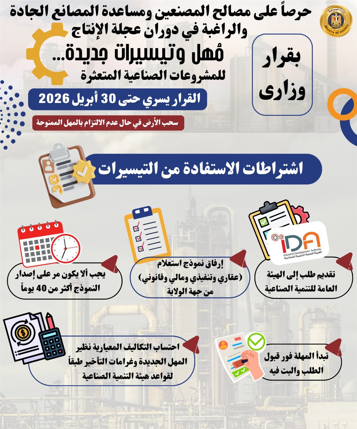 وتسري هذه المهل والتيسيرات التي ستنفذها الوزارة ممثلة في الهيئة العامة للتنمية الصناعية حتى 30 أبريل 2026 وتشمل: