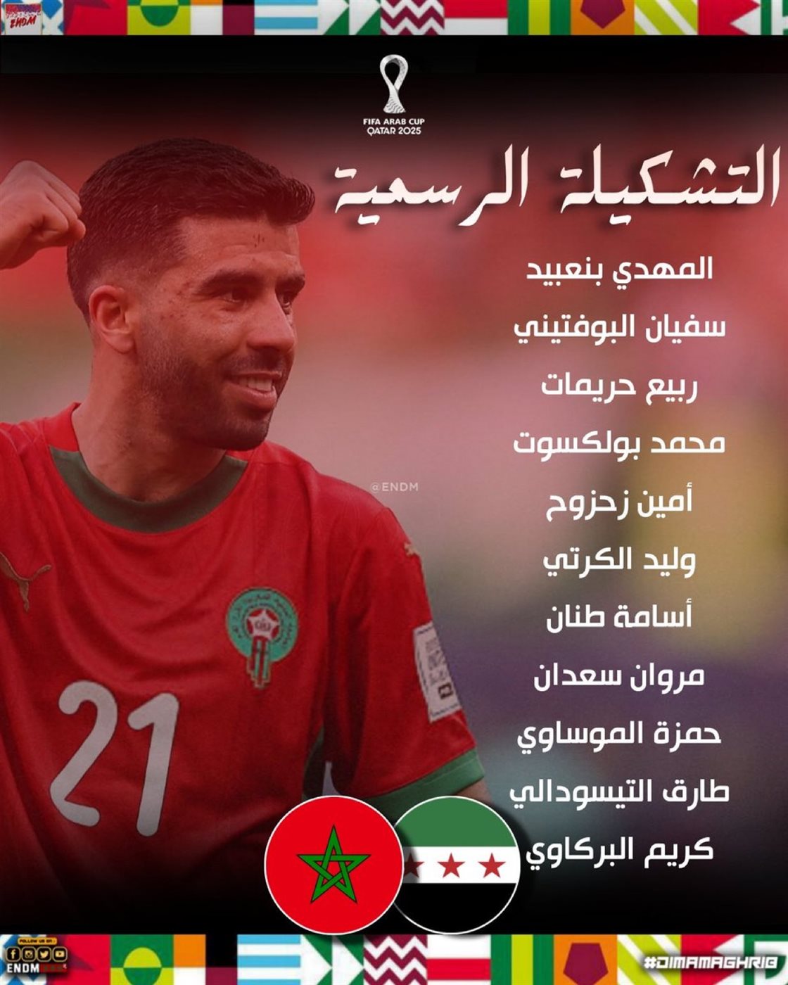 أعلن الجهاز الفني لمنتخب المغرب التشكيل الرسمي الذي سيخوض به مباراة اليوم ضد سوريا في إطار منافسات الدور ربع النهائي من بطولة كأس العرب 2025 المقامة في قطر.