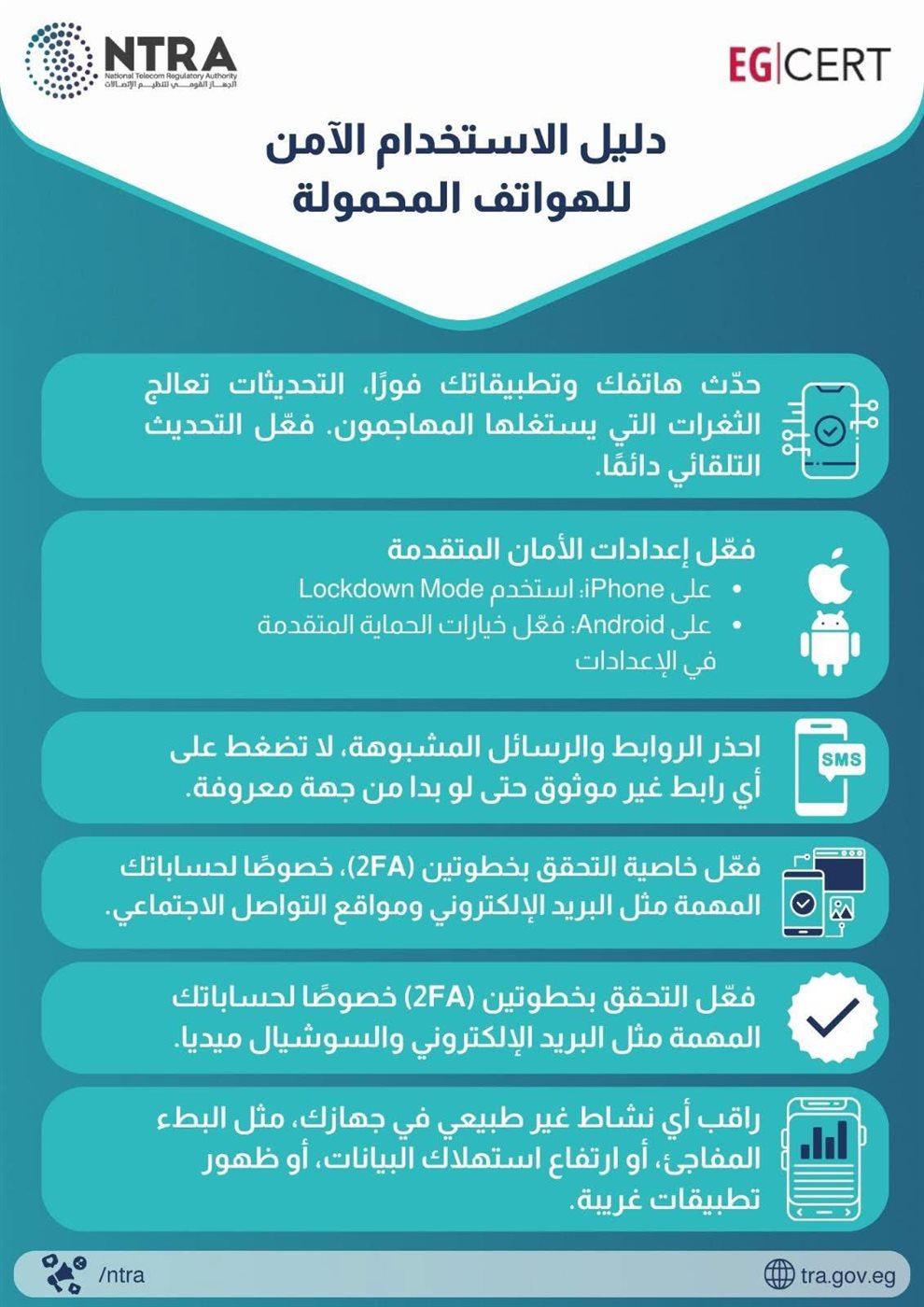 بهذه الخطوات العملية والبسيطة، يساعد الدليل الجديد المواطنين على حماية هواتفهم وبياناتهم، ويدعم توجه الدولة نحو مجتمع رقمي آمن وأكثر وعيًا بالمخاطر الإلكترونية.