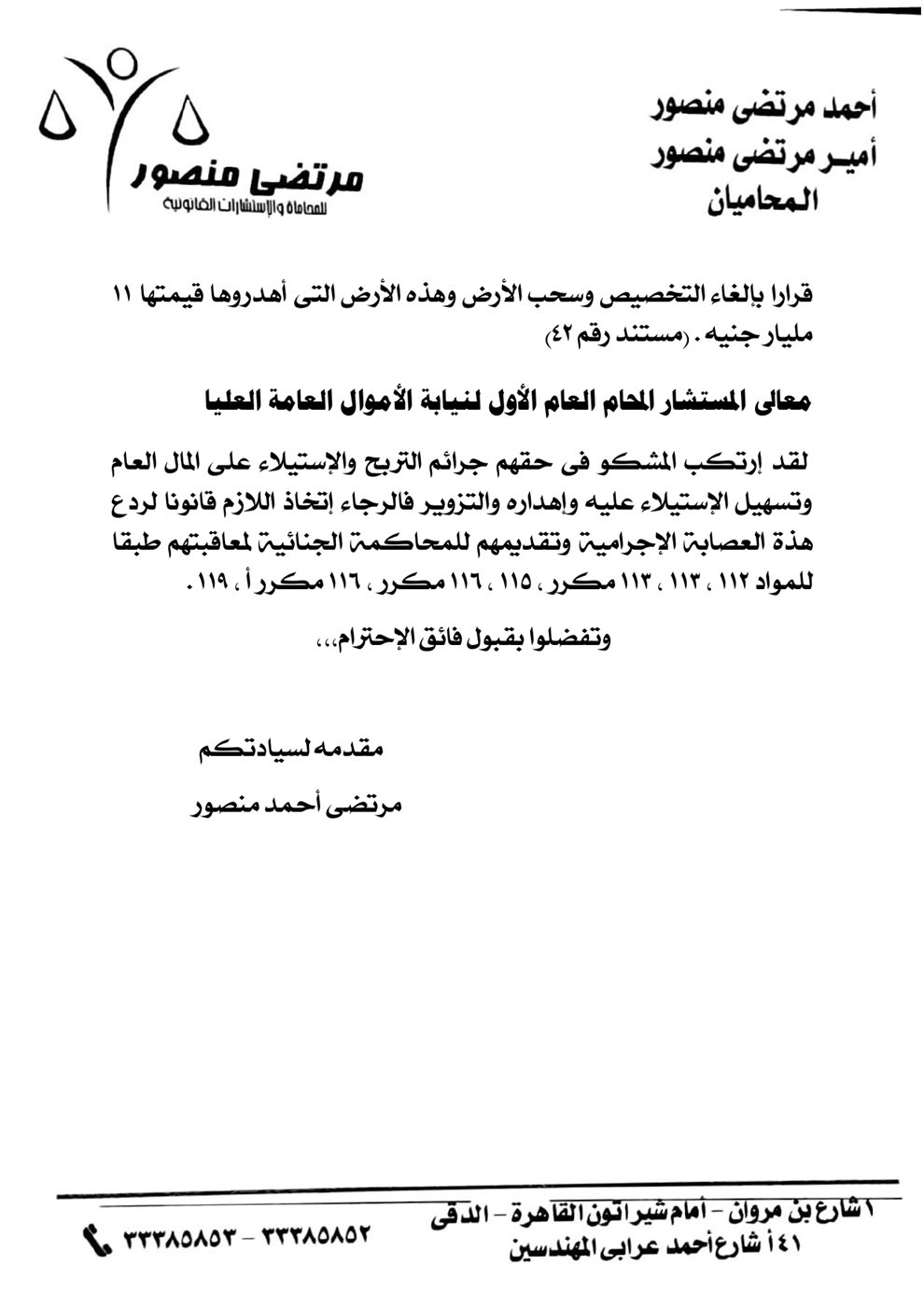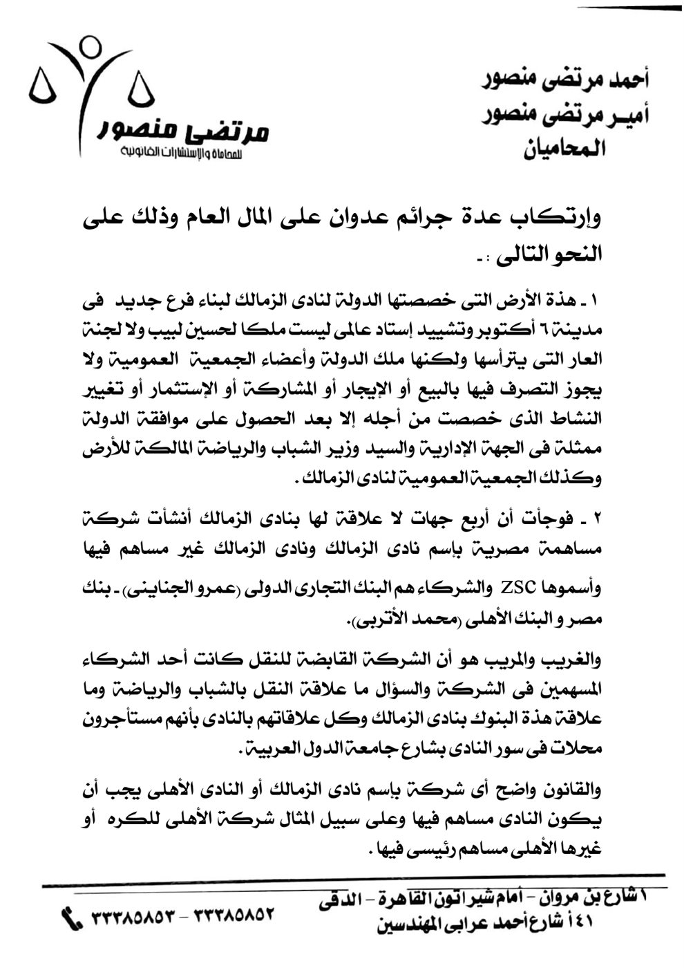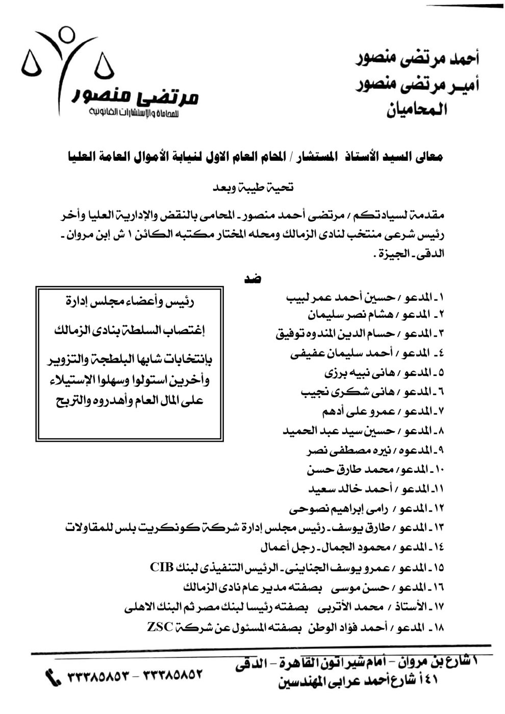يتقدم مرتضى منصور المحامي بالنقض والادارية العليا ببلاغ رسمي موجها الى المحامي العام الاول لنيابة الاموال العامة العليا ضد مجموعة من الاسماء الواردة بالنص الاصلي وعلى رأسهم حسين احمد لبيب وهشام نصر سليمان وحسام الدين المندوه توفيق واحمد سليمان عفيفي وهاني نبيه برزي وهاني شكري نجيب وعمرو علي ادهم وحسين سيد عبد الحميد ونيرة مصطفى نصر ومحمد طارق حسن واحمد خالد سعيد ورامي ابراهيم نصوحي اضافة الى طارق يوسف رئيس مجلس ادارة إحدي الشركات ومحمود الجمال رجل اعمال وعمرو يوسف الجنايني الرئيس التنفيذي لأحد البنوك الخاصة وحسن موسى مدير عام نادي الزمالك ومحمد الاتربي رئيس لأثنين من البنوك المملوكة للدولة الكبري واحمد فؤاد الوطن المسؤول عن إحدي الشركات الخاصة.