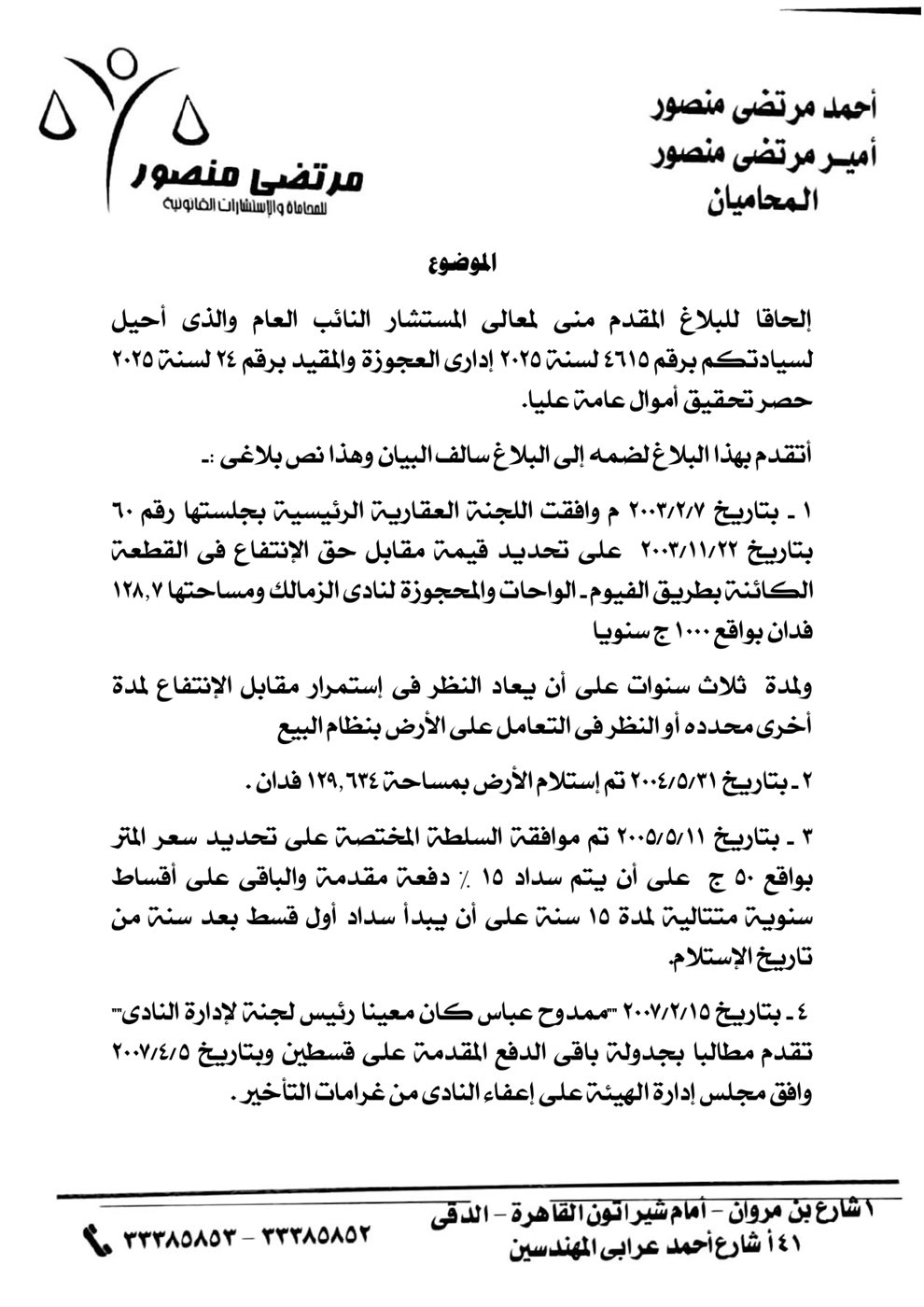 يبدأ البلاغ بسرد القرارات الرسمية منذ موافقة اللجنة العقارية الرئيسية في عام 2003 على تحديد مقابل حق الانتفاع لارض النادي بطريق الفيوم الواحات بمساحة تتجاوز 128 فدان ثم استلام الارض في 2004 ثم تحديد سعر المتر بخمسين جنيها في 2005 مع جدولة الاقساط على خمسة عشر عاما ثم طلب ممدوح عباس في 2007 جدولة المدفوعات واعفاء النادي من غرامات التأخير.