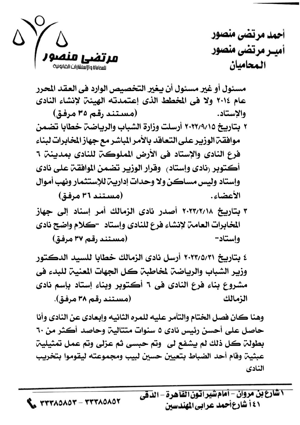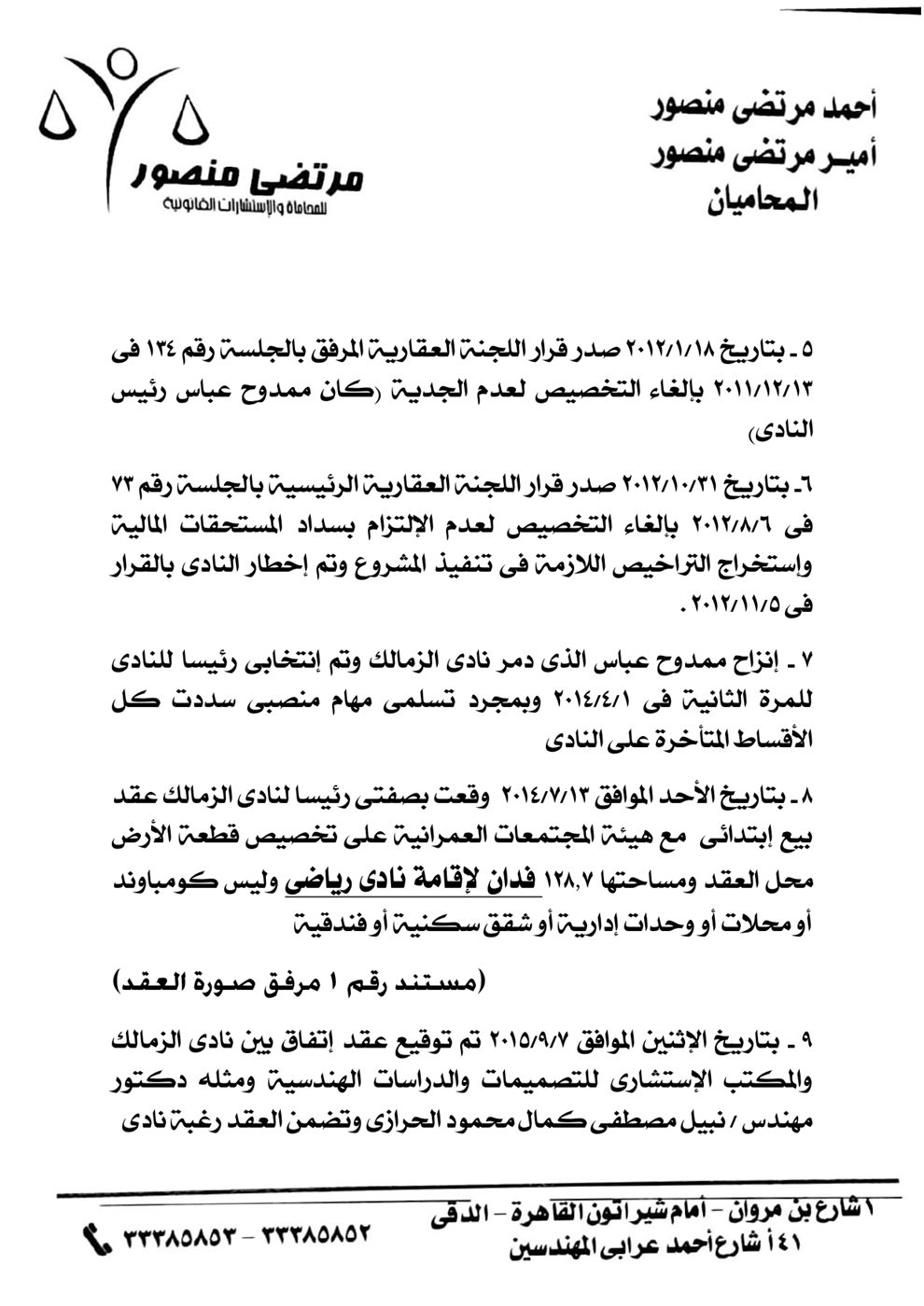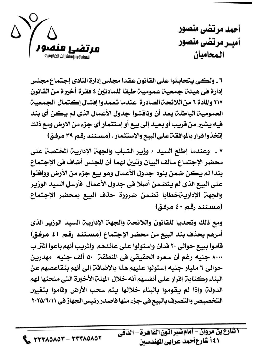 ويؤكد مقدم البلاغ انه بعد انتخابه رئيسا للنادي في ابريل 2014 قام بسداد جميع المتأخرات ووقع عقد بيع ابتدائي مع هيئة المجتمعات العمرانية لتخصيص الارض لصالح اقامة فرع رياضي وليس وحدات ادارية او تجارية.