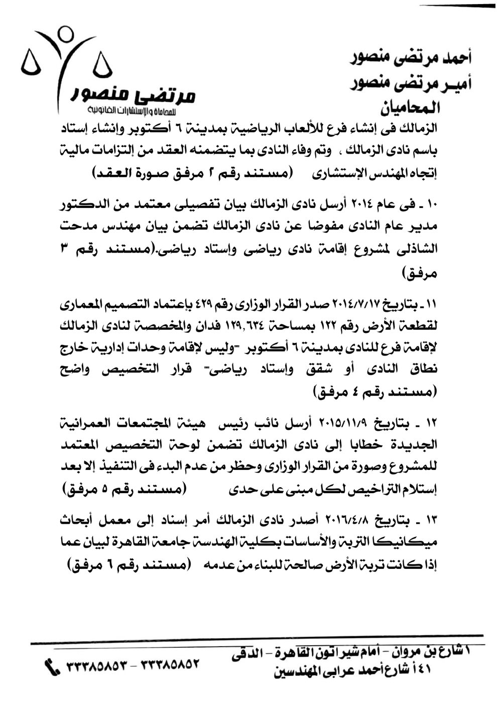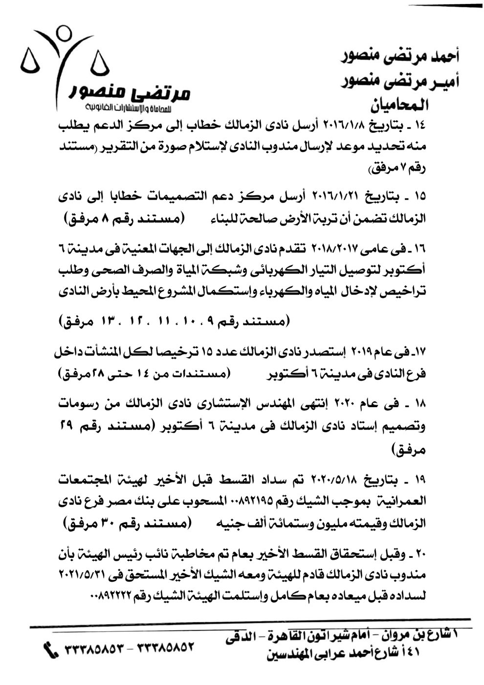 يتناول البلاغ التعاقد مع المكتب الاستشاري للدكتور المهندس نبيل مصطفى كمال الحرازي في 2015 لتصميم منشآت فرع النادي واستاد يحمل اسم نادي الزمالك مع سداد كامل مستحقاته كما يستعرض الاعمال الفنية لتقارير التربة ومراسلات الهيئة بشأن التراخيص في الفترة من 2016 الى 2019 الى جانب استصدار خمسة عشر ترخيصا لاقامة منشآت فرعية واستكمال تصميم الاستاد في 2020.