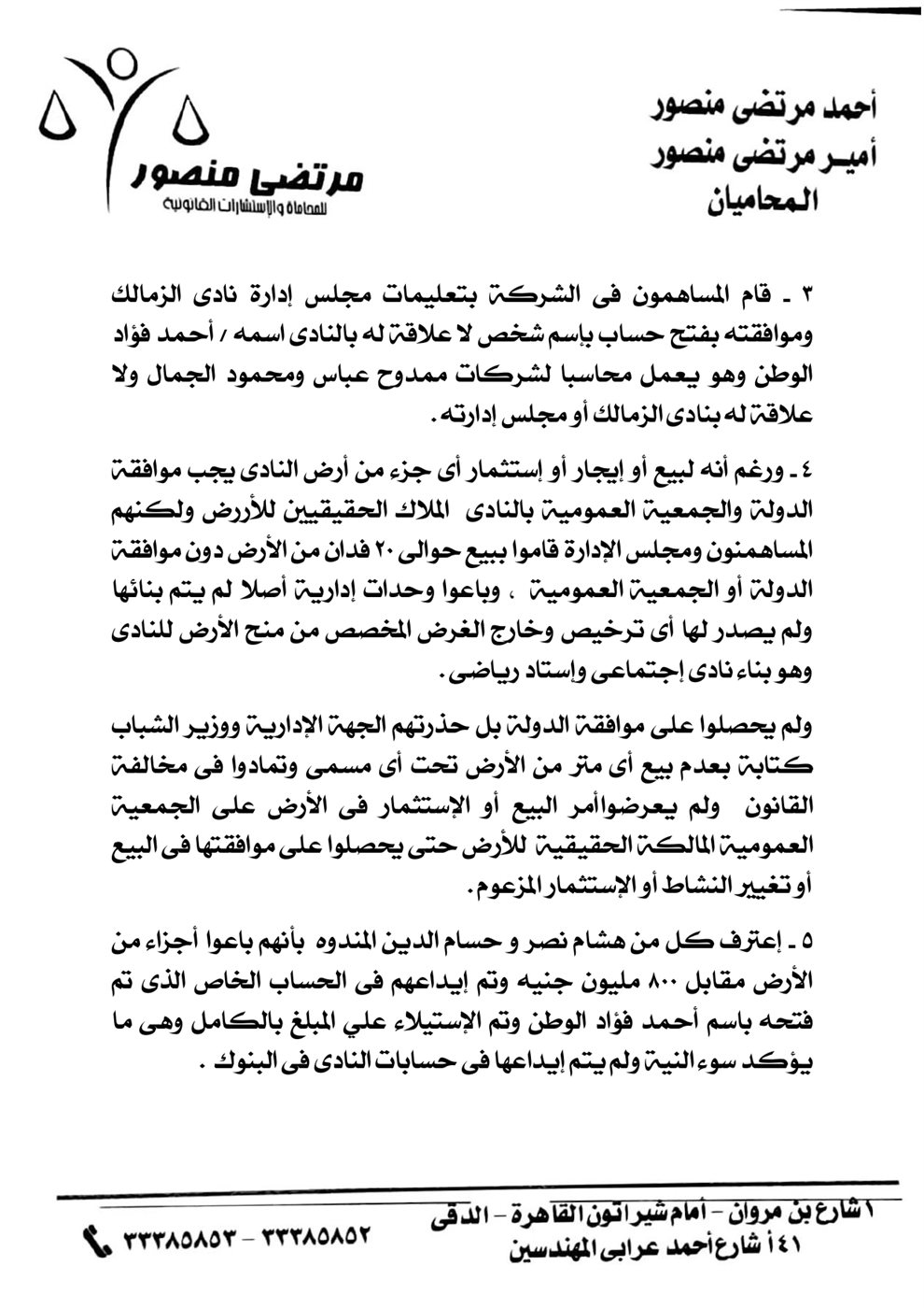 ويؤكد البلاغ بيع حوالي عشرين فدانا من الارض من دون موافقة الدولة او الجمعية العمومية مع تحصيل نحو 800 مليون جنيه خارج حسابات النادي.