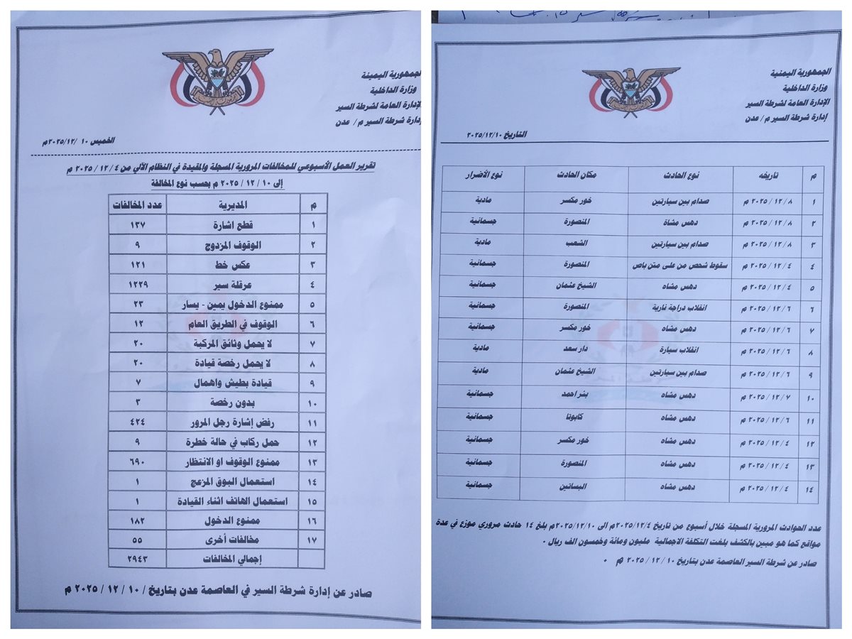 كشف تقرير رسمي صادر عن إدارة شرطة السير في العاصمة عدن عن أرقام المخالفات المرورية والحوادث خلال الأسبوع الممتد من 4 إلى 10 ديسمبر 2025م مؤكدا استمرار الجهود المكثفة للحد من الانتهاكات المرورية وتعزيز سلامة الطرق.