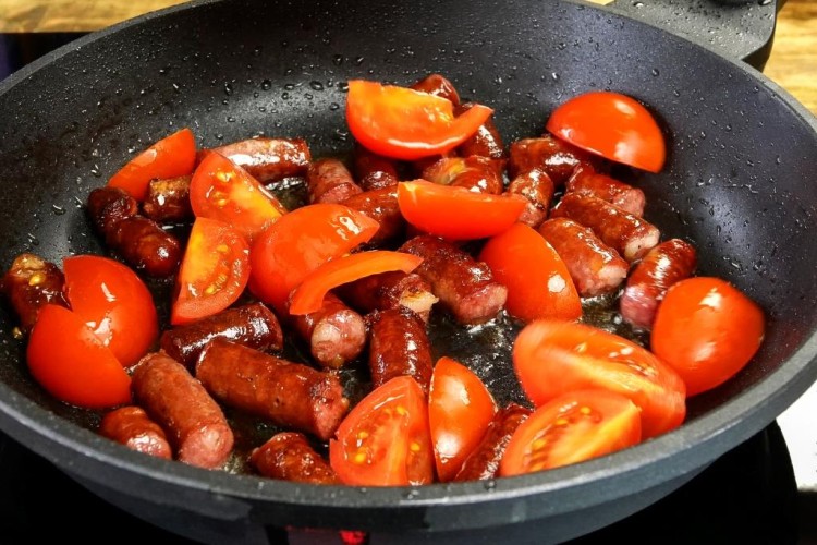 أضيفي السجق مرة أخرى إلى المقلاة، وقلّبي برفق مع الخضار والصلصة لمدة دقيقتين حتى تمتزج النكهات.
