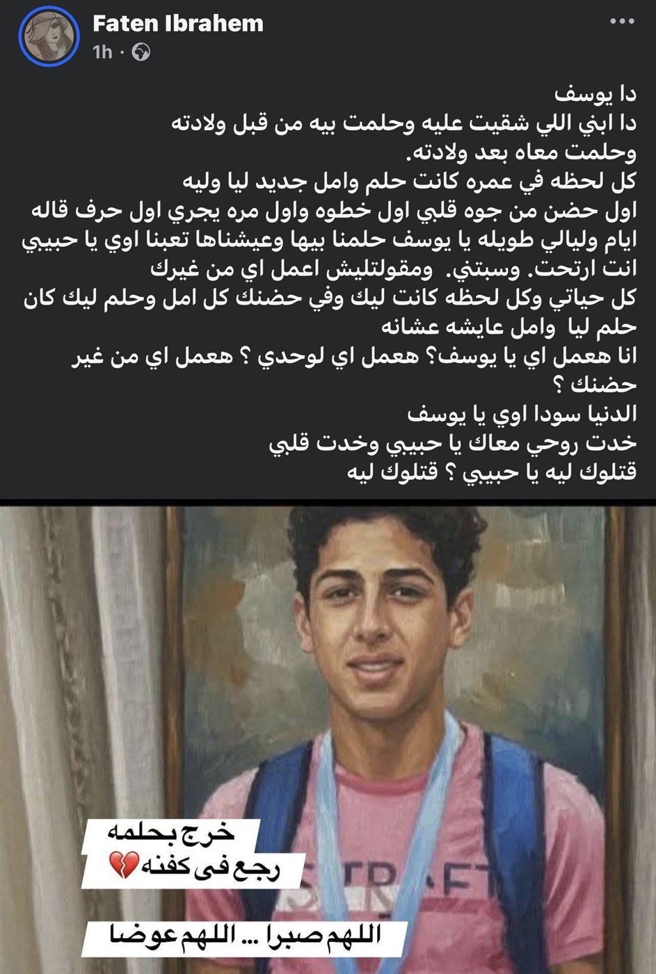 واختتمت والدة السباح يوسف منشورها قائلة: “الدنيا سودا اوي يا يوسف خدت روحي معاك يا حبيبي وخدت قلبي قتلوك ليه يا حبيبي ؟ قتلوك ليه”.