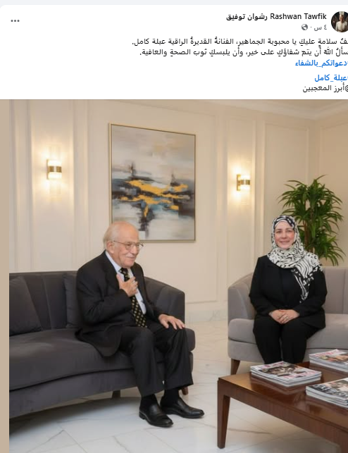 نشر رشوان صورة تجمعه بـ عبلة كامل عبر صفحته على فيس بوك وعلق عليها قائلا: "ألف سلامة عليك يا محبوبة الجماهير، الفنانة القديرة الراقية عبلة كامل، نسأل اللهَ أن يتم شفاؤك على خير، وأن يلبسك ثوب الصحة والعافية".