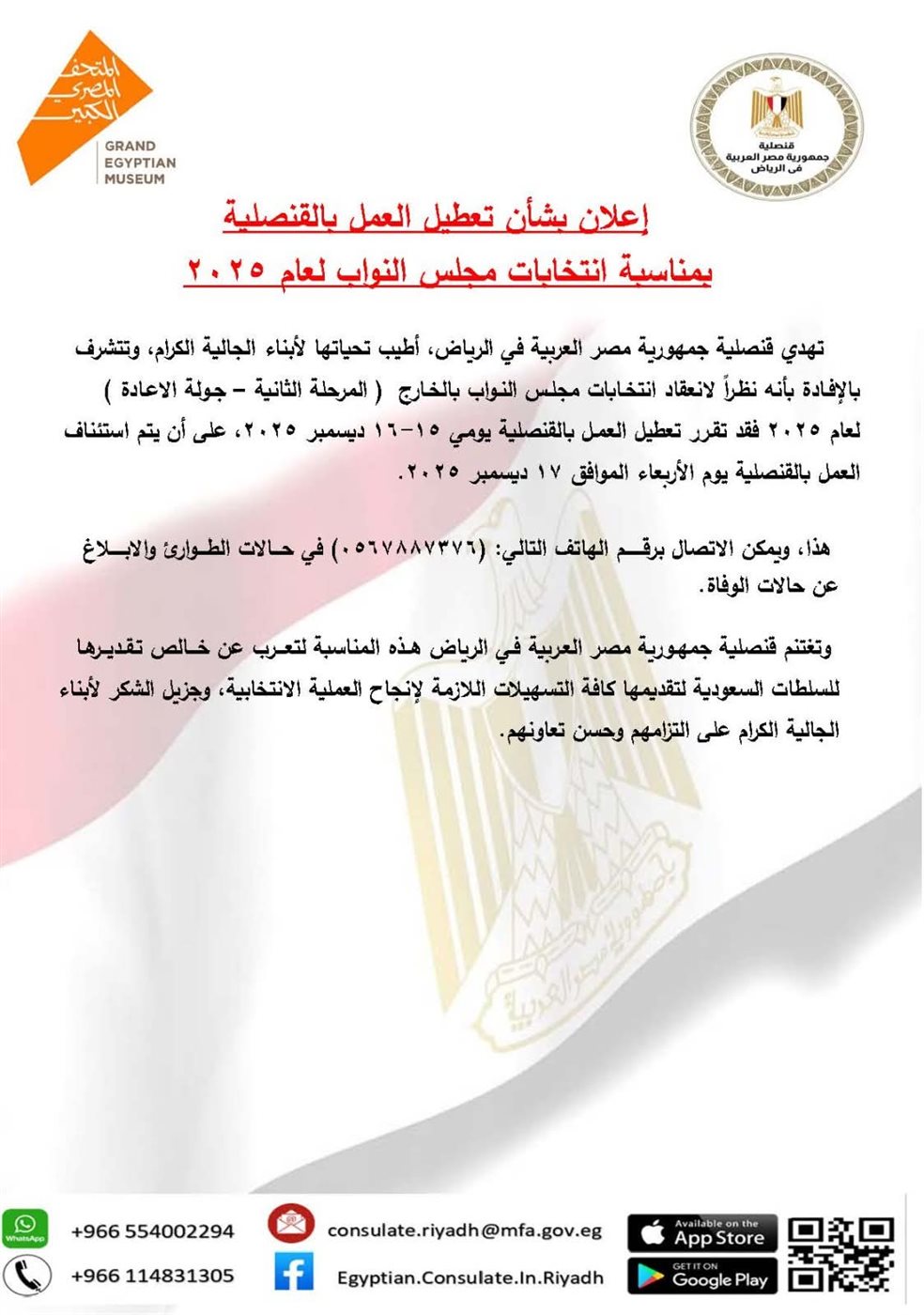 أعلنت قنصلية جمهورية مصر العربية في الرياض عن تعطيل العمل بالقنصلية مؤقتًا، وذلك بمناسبة انعقاد انتخابات مجلس النواب للمصريين بالخارج لعام 2025 (المرحلة الثانية – جولة الإعادة).