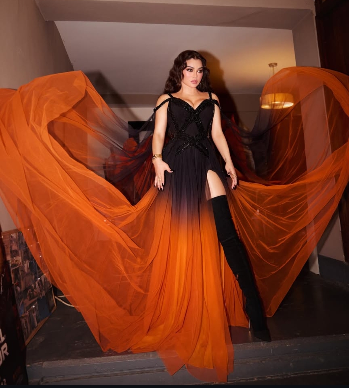 وبدت هيفاء وهبي بإطلالة ساحرة، مرتديه فستان طويل صمم بشكل لافت، من قماش المخمل في الحرير جمع بين اللونين الأسود في البرتقالي الناري فيما انتعلت بوت طويل وصل لحدود الركبة باللون الأسود.
