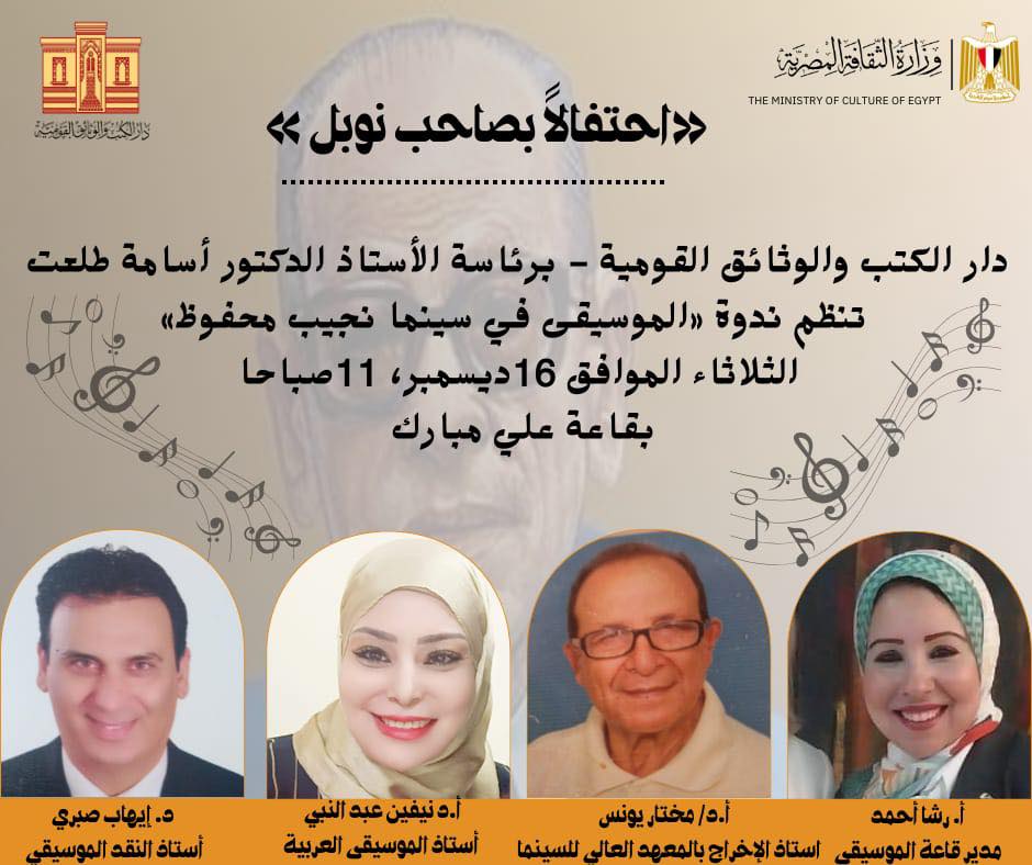 وتُعقد الندوة بقاعة علي مبارك، بدار الكتب والوثائق القومية، حيث تناقش العلاقة بين الموسيقى والدراما السينمائية في أفلام نجيب محفوظ، ودورها في التعبير عن رؤاه الأدبية والإنسانية.