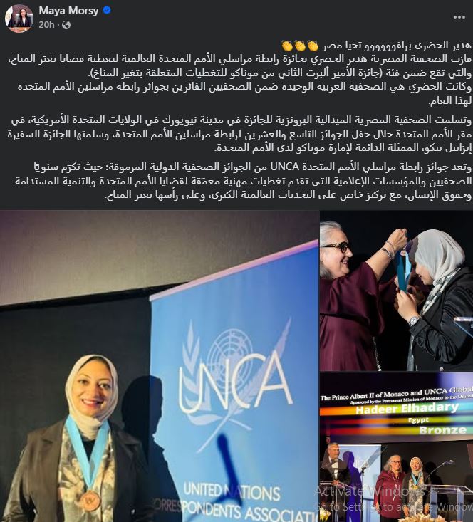 وكتبت مايا مرسي: “هدير الحضرى برافوووووو تحيا مصر فازت الصحفية المصرية هدير الحضري بجائزة رابطة مراسلي الأمم المتحدة العالمية لتغطية قضايا تغيّر المناخ، والتي تقع ضمن فئة (جائزة الأمير ألبرت الثاني من موناكو للتغطيات المتعلقة بتغير المناخ)”.