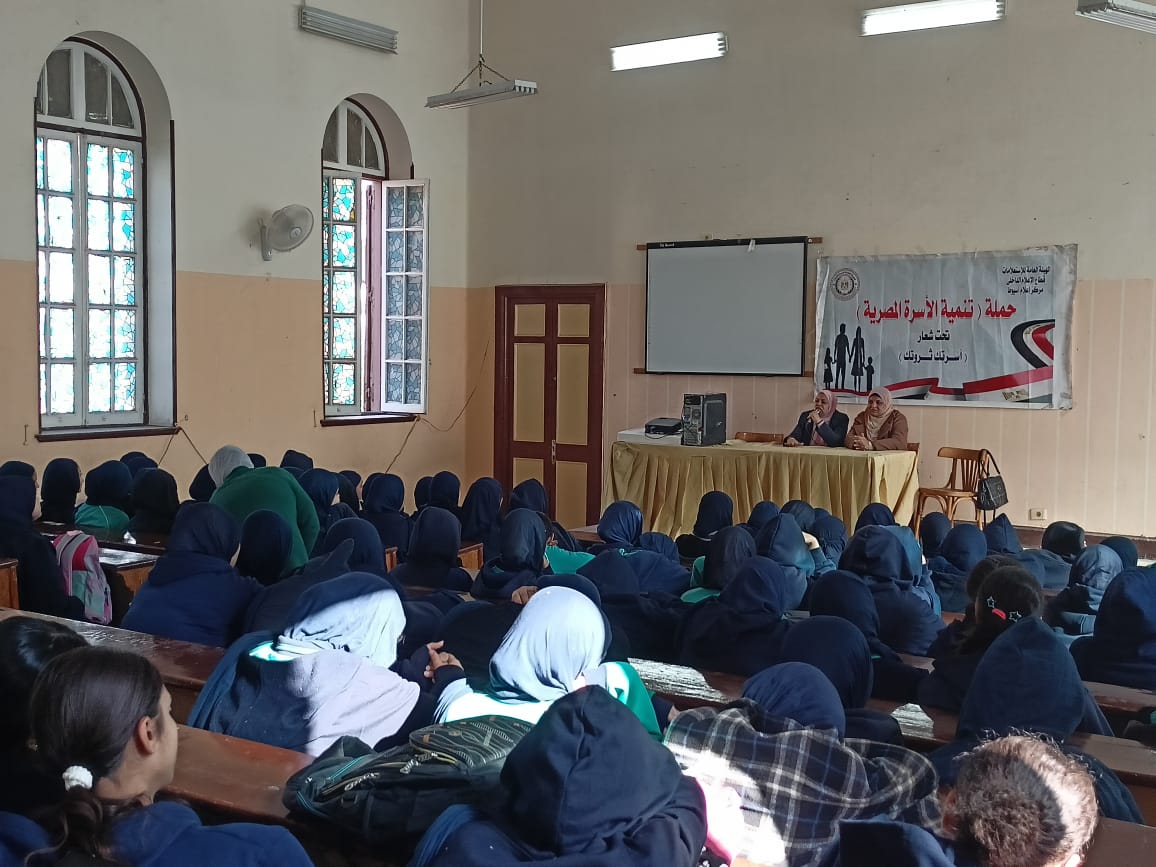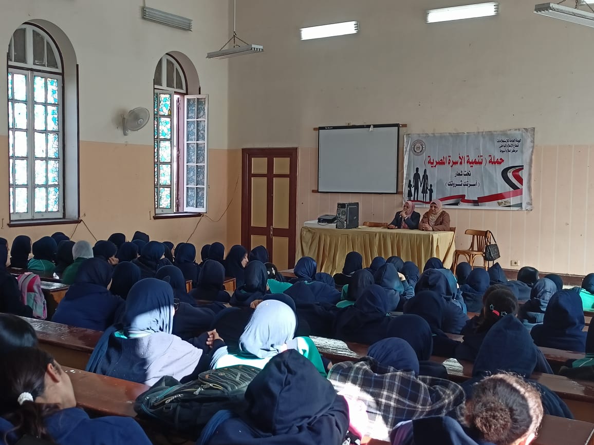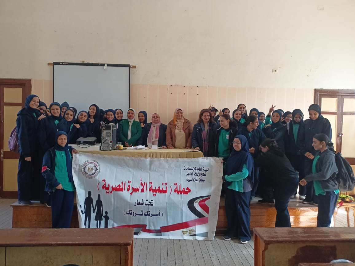 نظم مجمع إعلام أسيوط ندوة تثقيفية تحت عنوان "تنمية الأسرة المصرية استثمار لبكره"، بمدرسة خديجة يوسف الثانوية بنات، في إطار حملة قطاع الإعلام الداخلي بالهيئة العامة للاستعلامات برئاسة الدكتور أحمد يحيى، وبإشراف حمدي سعيد رئيس الإدارة المركزية لإعلام شمال ووسط الصعيد، حيث استهدفت الندوة تعزيز الوعي المجتمعي وترسيخ القيم الصحية والغذائية داخل الأسرة المصرية.