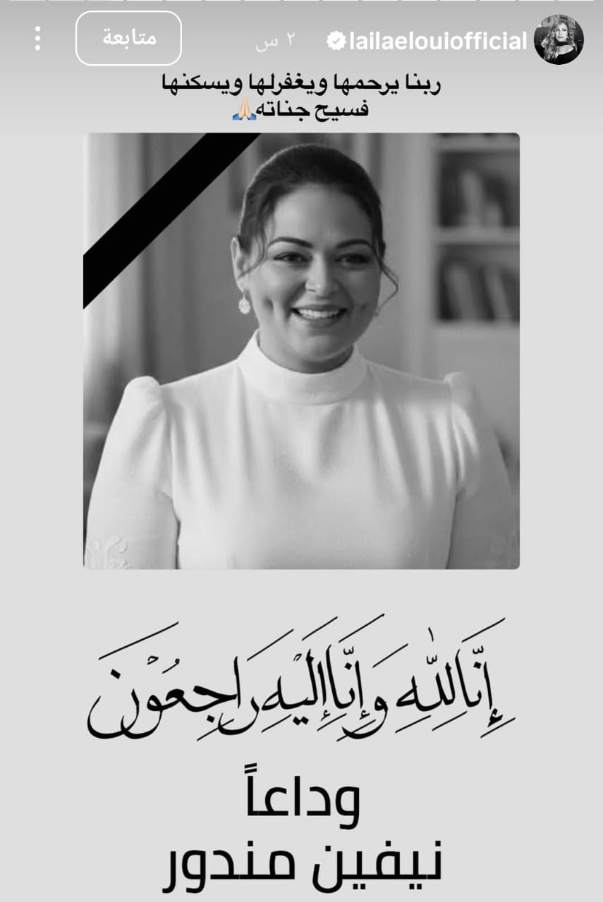 نشرت الفنانة ليلى علوي عبر خاصية «ستوري» على حسابها الرسمي بموقع تبادل الصور والفيديوهات الأشهر  إنستجرام صورة للفنانة الراحلة نيفين مندور، معبرة عن حزنها لفقدانها، وعلقت ليلى علوي على الصورة: «ربنا يرحمها ويغفر لها ويسكنها فسيح جناته».