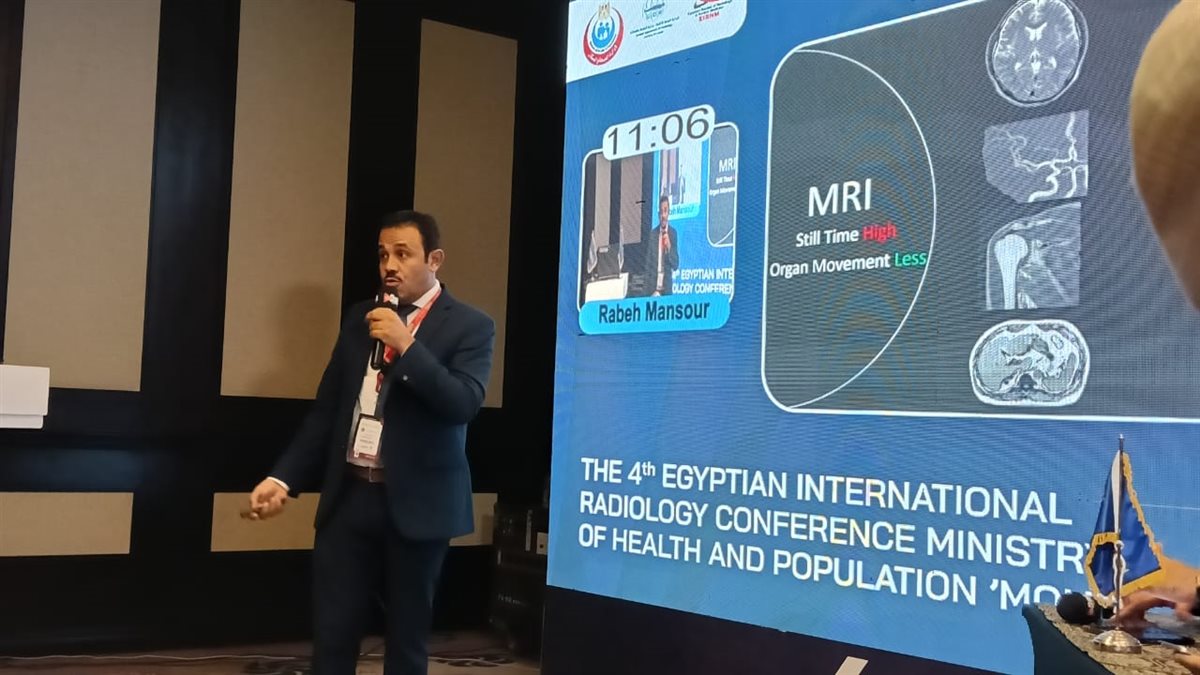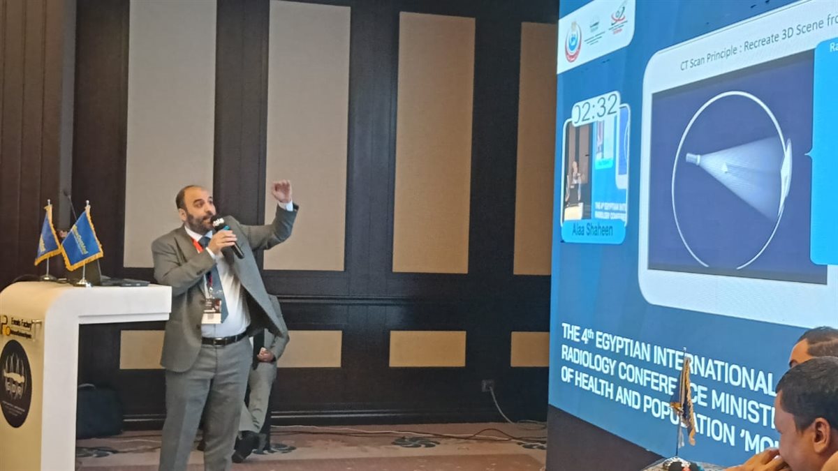 عرض أحمد السيد الدبيكي، نقيب العلوم الصحية، خلال محاضرة في اليوم الأول، ضمن فعاليات المؤتمر الدولي الرابع للأشعة، الذي تنظمه الإدارة العامة للأشعة بوزارة الصحة.