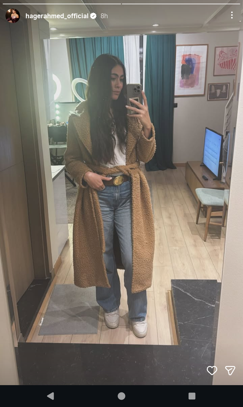 وظهرت هاجر أحمد بإطلالة كاجوال أنيقة، حيث ارتدت ملابس عصرية مع بالـطو، ما أبرز جمالها ورشاقتها وخطف أنظار جمهورها.