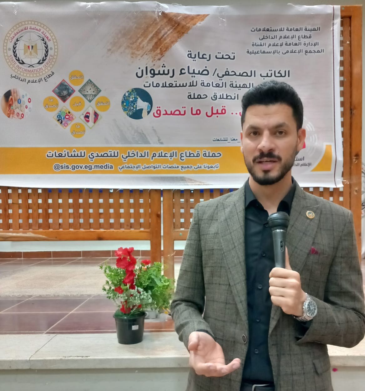 وحاضر بالندوة التي أقيمت اليوم بمركز إعلام الإسماعيلية بعنوان الإعلام والوعى فى مواجهة الشائعات الدكتور باسم المغربى مدرس العلوم السياسية بجامعة قناة السويس والإعلامي أحمد فاروق كبير مذيعى إذاعة القناة بالإسماعيلية والدكتور حسن يوسف العميد الأسبق لكلية الآداب جامعة القناة وقد دارت أهم محاور اللقاء حول مدى أهمية الإعلام والوعي باعتبارهما خط الدفاع الأول ضد الشائعات، حيث يعمل الإعلام على نشر المعلومات الصحيحة وتفنيد المغلوط، بينما يبني الوعي قدرة الأفراد على التفكير النقدي والتحقق قبل النشر، مما يقلل من تأثير الشائعات التي تزدهر في بيئة نقص المعلومات والوعي. المواجهة تتطلب جهودًا مشتركة من الإعلام الرسمي والمجتمع المدني والأفراد، بتعزيز الثقة والشفافية ونشر ثقافة المسؤولية الرقمية.