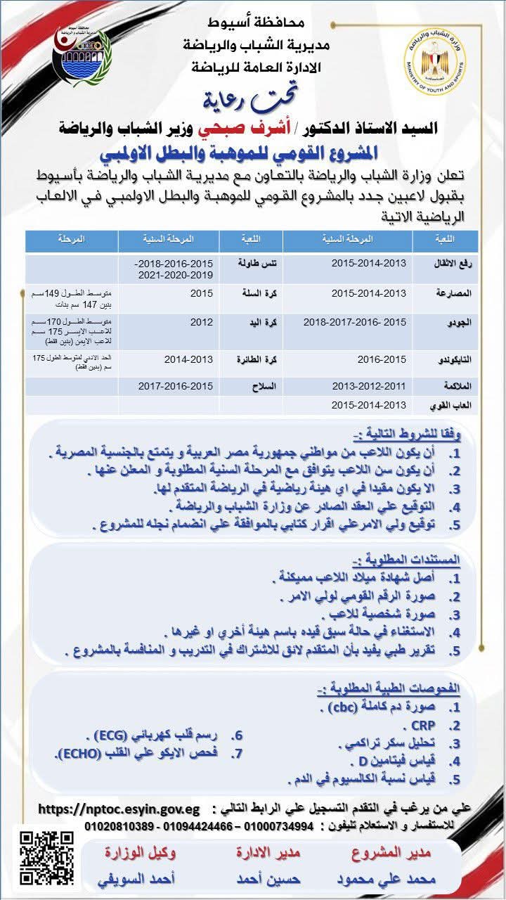 وأوضح المحافظ أن مديرية الشباب والرياضة بأسيوط بقيادة أحمد سويفي وكيل الوزارة تستقبل المستندات المطلوبة والخضوع للفحوصات الطبية اللازمة من خلال الرابط https://nptoc.esyin.gov.eg وفق الشروط المعلنة حيث يشمل المشروع عددًا من الألعاب الرياضية من بينها رفع الأثقال، المصارعة، الجودو، التايكوندو، الملاكمة، ألعاب القوى، تنس الطاولة، كرة السلة، كرة اليد، كرة الطائرة، والسلاح، وفقًا للفئات العمرية المحددة لكل لعبة.