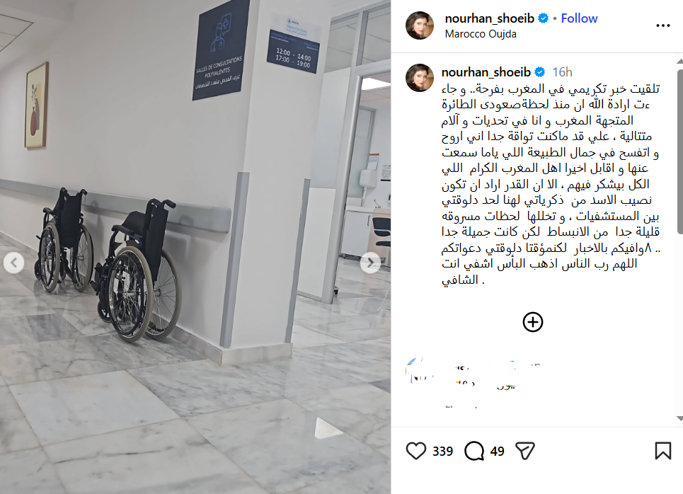 وقالت شعيب في منشورها: «تلقيت خبر تكريمي في المغرب بفرحة.. و جاء ءت ارادة الله ان منذ لحظةصعودى الطائرة المتجهة المغرب و انا في تحديات و آلام متتالية ، علي قد ماكنت تواقة جدا اني اروح و اتفسح في جمال الطبيعة اللي ياما سمعت عنها و اقابل اخيرا اهل المغرب الكرام اللي الكل بيشكر فيهم ، الا ان القدر اراد ان تكون نصيب الاسد من ذكرياتي لهنا لحد دلوقتي بين المستشفيات ، و تخللها لحظات مسروقه قليلة جدا من الانبساط لكن كانت جميلة جدا .. اوافيكم بالاخبار لكن مؤقتا دلوقتي دعواتكم اللهم رب الناس اذهب البأس اشفي انت الشافي" .