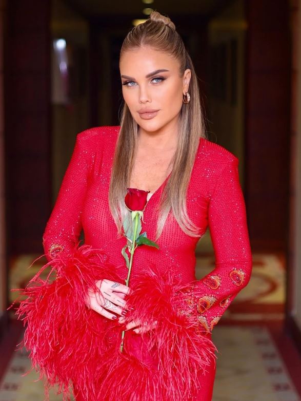 وبدت نيكول سابا بإطلالة رومانسية تتناغم مع احتفالات الكريسماس، مرتدية فستان طويل مجسم بأكمام طويلة مزين بالريش من الأطراف، صمم من قماش ناعم باللون الأحمر الصارخ، الفستان عكس قوامها الرشيق ووزنها المثالي.