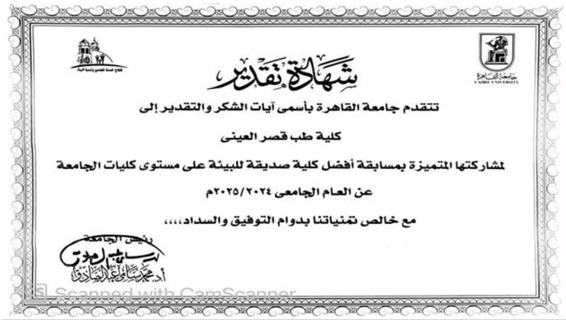 حصلت كلية طب قصر العيني لأول مرة على شهادة الايزو في إدارة البيئة 14001/2015 ISO و الصحة المهنية ISO 45001/2018 مما يعكس مدى وعى الكلية بالمسؤولية الاجتماعية من خلال الالتزام بالعمل الأمن والصحي والمستدام، وتم تأهيل الكوادر البشرية بالكلية من خلال عمل برامج تدريبية وتوعوية.