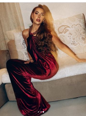 وبدت هبة عبدالعزيز بإطلالة خريفية جذابة، مرتدية فستان طويل مجسم، مصمم بشكل مختلف من قماش المخمل الناعم باللون البرغندي، لتواكب موضة خريف وشتاء 2025-2026.