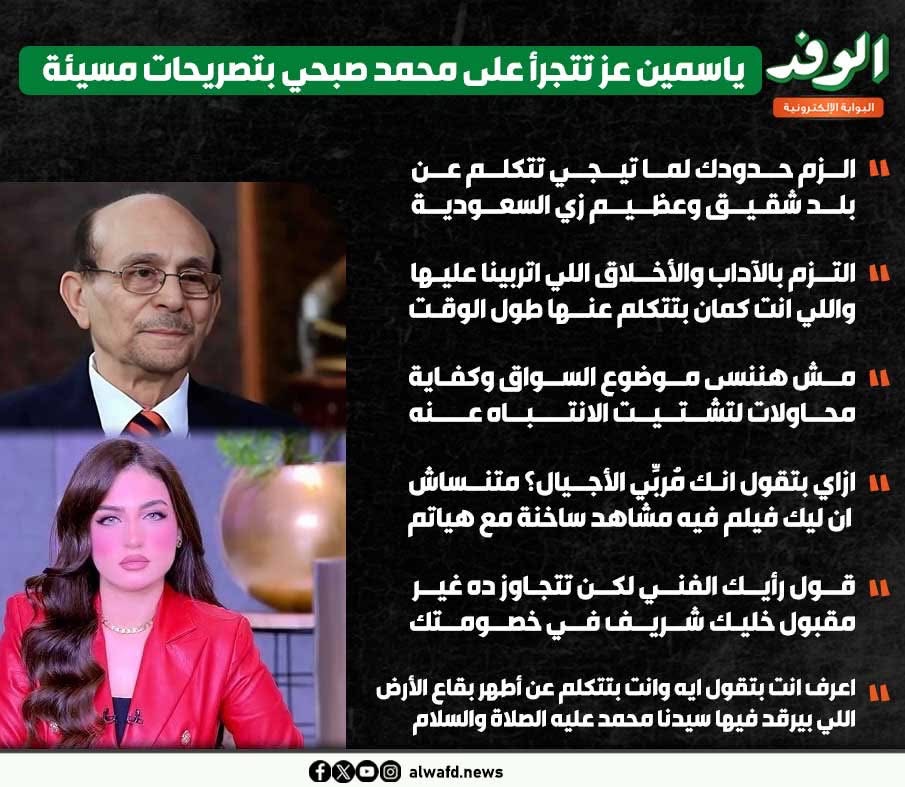 قالت ياسمين عز: “محمد صبحي لما تيجي تتكلم عن بلد شقيق بلد عظيم وكريم زي السعودية تلزم حدودك.. وتلتزم بالآداب والأخلاق العامة اللي اتربينا عليها واللي أنت كمان بتتكلم عنها وبتتغنى وتتشدق بيها لينا طول الوقت”.