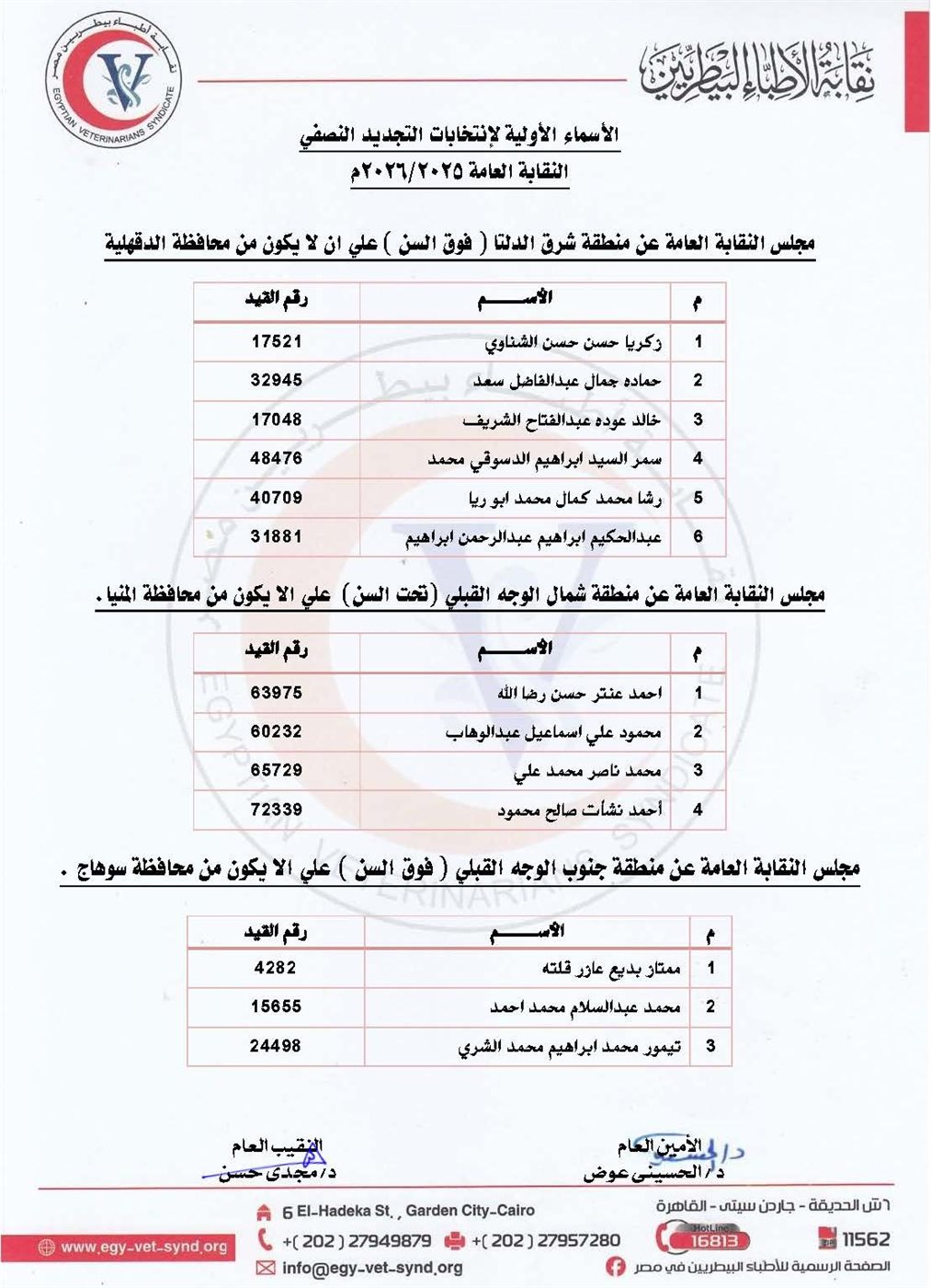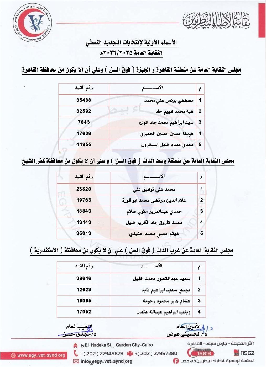 وأكدت النقابة العامة للأطباء البيطريين، أنه سيتم إتاحة الكشوف الأولية للاطلاع أمام الأعضاء، لإبداء الملاحظات أو التقدم بالطعون، وفق المواعيد والآليات التي تقررها اللجنة المشرفة على انتخابات التجديد النصفي.