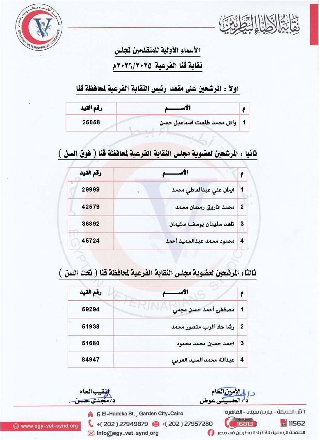 نقابة الأطباء البيطريين تعلن الكشوف الأولية لمرشحي انتخابات التجديد النصفي وفرعية قنا