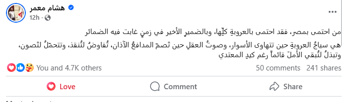 وكان من بين هؤلاء المُعلق الرياضي الشهير هشام معمر الذي قال :" من احتمى بمصر، فقد احتمى بالعروبةِ كلِّها، وبالضميرِ الأخير في زمنٍ غابت فيه الضمائر