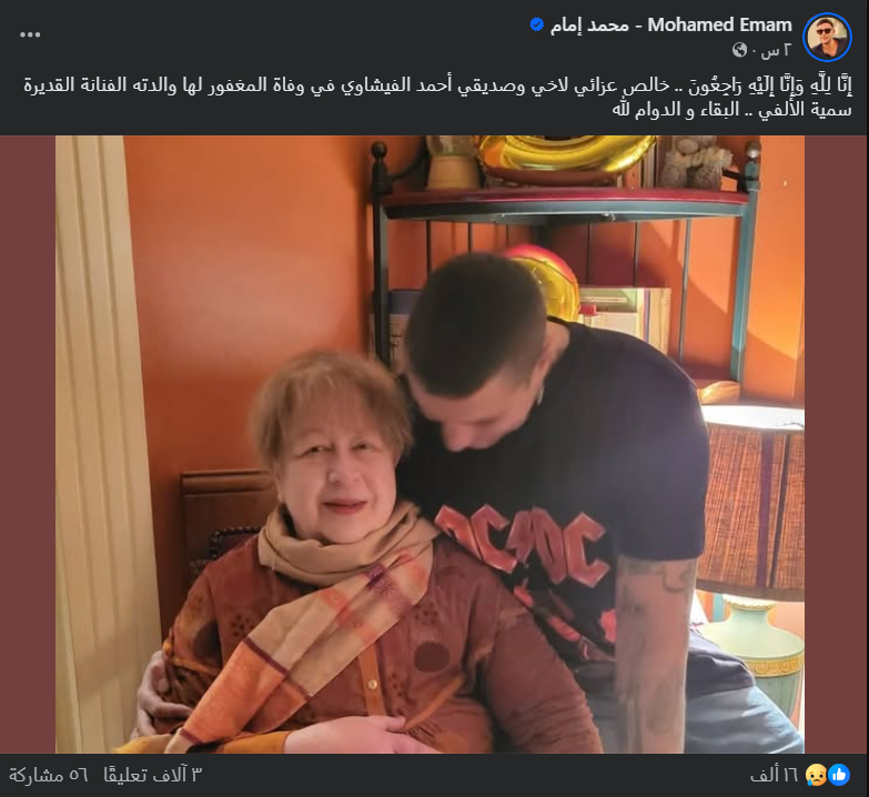 نعى النجم محمد إمام الفنانة القديرة سمية الألفي، عبر حسابه الرسمي على موقع فيسبوك، حيث كتب:"إِنَّا لِلَّهِ وَإِنَّا إِلَيْهِ رَاجِعُونَ.. خالص عزائي لأخي وصديقي أحمد الفيشاوي في وفاة المغفور لها والدته الفنانة القديرة سمية الألفي.. البقاء والدوام لله".