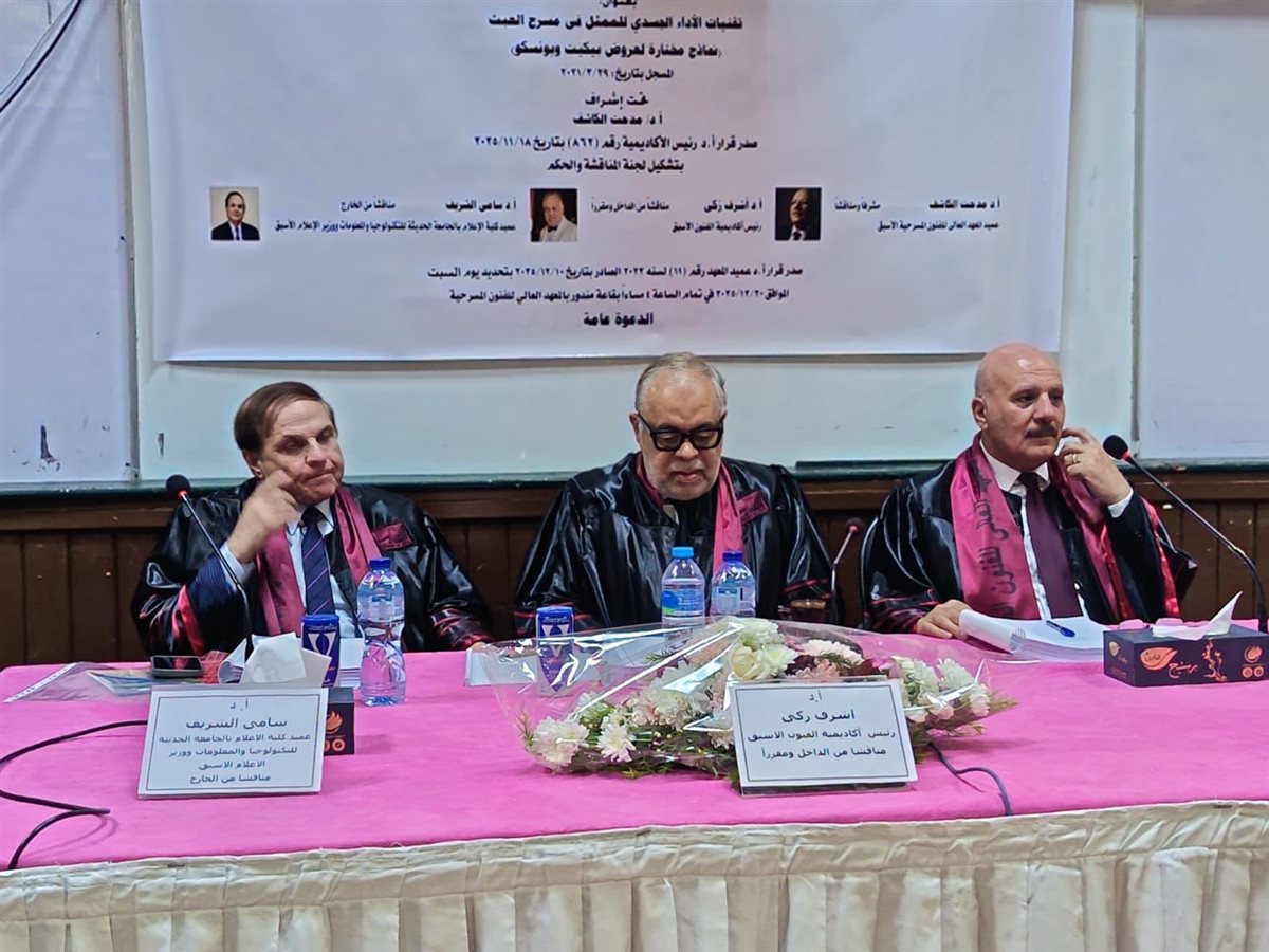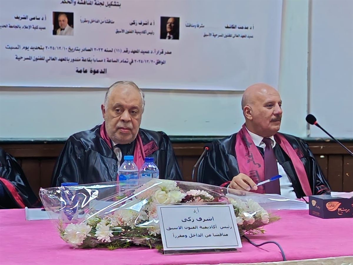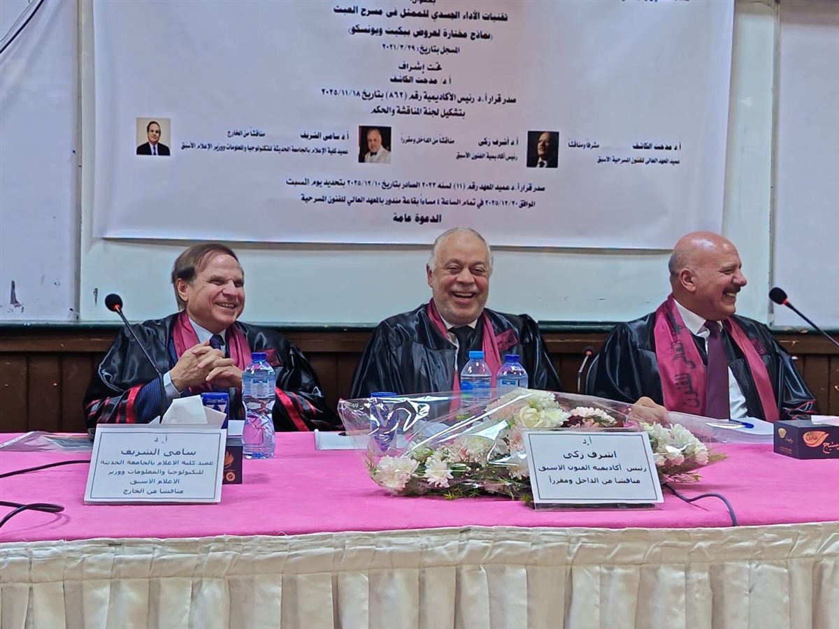 وأشادت لجنة المناقشة بالرسالة، مؤكدة تميزها علميًا وتطبيقيًا، وثراءها المرجعي، وقدرتها على الربط بين الجانب الأكاديمي والخبرة المسرحية العملية، وهو ما انعكس في قرار منح الباحث درجة الدكتوراه بمرتبة الشرف.