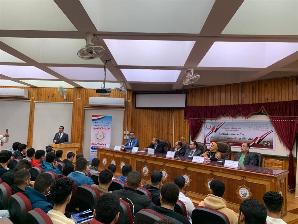 انطلقت فعاليات ندوة نظمها مجمع إعلام البحيرة لتأكيد مكانة العمل الأهلي كأحد أعمدة التنمية الوطنية وذلك ضمن باكورة أنشطة حملة قطاع الإعلام الداخلي المعنونة العمل الأهلي الضلع الثالث للتنمية تحت شعار مجتمعنا مسؤوليتنا حيث جرت الفعالية داخل كلية الشريعة والقانون بدمنهور وربطت بين ثقافة التطوع ومتطلبات رؤية مصر 2030.