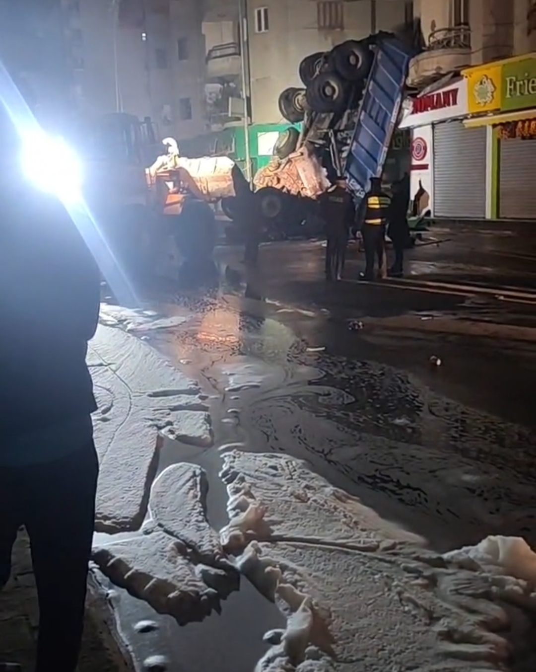 خسائر بالجملة بسبب سقوط سيارة نقل من دائري ترسا.. صور