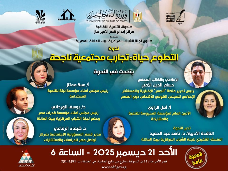 يقيم قطاع صندوق التنمية الثقافية برعاية المعماري حمدي السطوحي، اليوم الأحد الموافق21 ديسمبر 2025، ندوة لجنة الشباب المركزية لبيت العائلة المصرية بمركز إبداع قصر الأمير طاز بشارع السيوفية بعنوان ” التطوع حياة: تجارب مجتمعية ناحجة” وذلك في تمام الساعة السادسة مساءً.