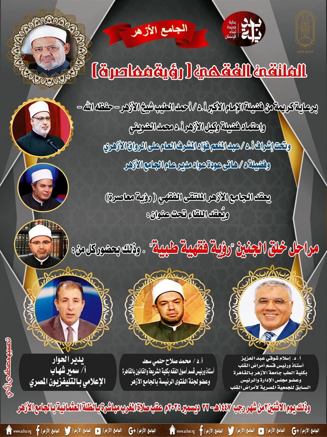 يعقد غداً يعقد الجامع الأزهر، الملتقى الفقهي بين الشرع والطب الحادي والأربعون بعنوان "رؤية معاصرة"، والذي يناقش على مائدته: مراحل خلق الجنين "رؤية فقهية طبية"، ويستضيف الملتقى: الدكتور محمد صلاح سعد، أستاذ ورئيس قسم أصول الفقه بكلية الشريعة والقانون بالقاهرة، وعضو لجنة الفتوى الرئيسة بالجامع الأزهر، والدكتور إسلام شوقي عبد العزيز، أستاذ ورئيس قسم أمراض القلب بكلية الطب جامعة الأزهر بالقاهرة، وعضو مجلس الإدارة، والرئيس السابق للجمعية المصرية لأمراض القلب، ويُدير الحوار، الأستاذ سمير شهاب، الإعلامي بالتلفزيون المصري.