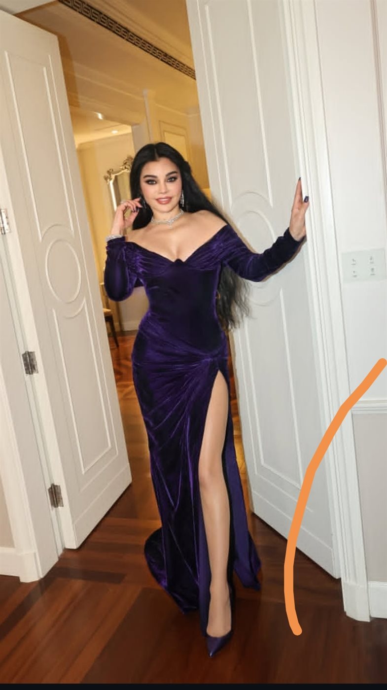 وبدت هيفاء وهبي بإطلالة ساحرة مزجت بين الأنوثة والجاذبية في آن واحد مما جعلها محط أهتمام وإعجاب متابعيها و جمهورها، مرتديه فستان طويل مجسم، بأكمام طويلة، صمم من قماش المخمل الناعم باللون البنفسج اتسم الفستان بشق كشف عن أحد ساقيها.