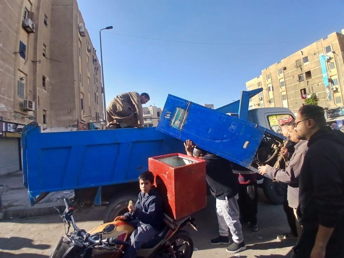 • شن حملة موسعة لإزالة الإشغالات أمام المحلات والباعة الجائلين بعدد من أحياء المجاورات في التجمع الأول.