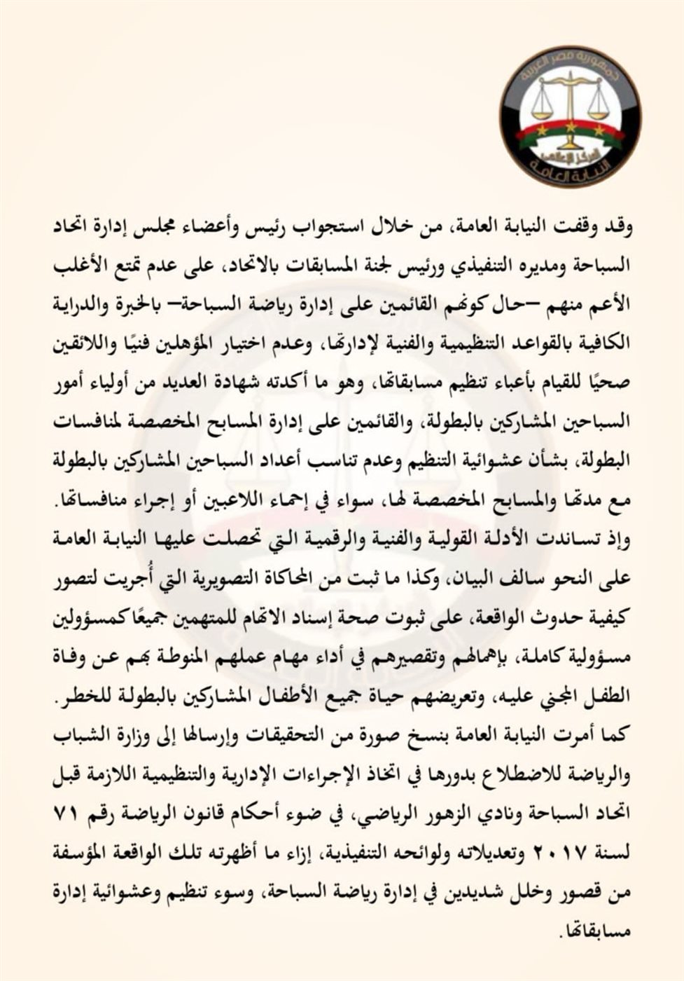 وأمرت النيابة العامة بنسخ صورة من التحقيقات وإرسالها إلى وزارة الشباب والرياضة لاتخاذ الإجراءات الإدارية والتنظيمية اللازمة تجاه اتحاد السباحة ونادي الزهور الرياضي، وفقًا لقانون الرياضة رقم 71 لسنة 2017، لا سيما بعد ما تبين من خلل جسيم في تنظيم البطولة وإهمال في تنفيذ قرار وزارة الشباب رقم 1642 لسنة 2024 الخاص بالإجراءات الطبية الواجبة لضمان سلامة الرياضيين.