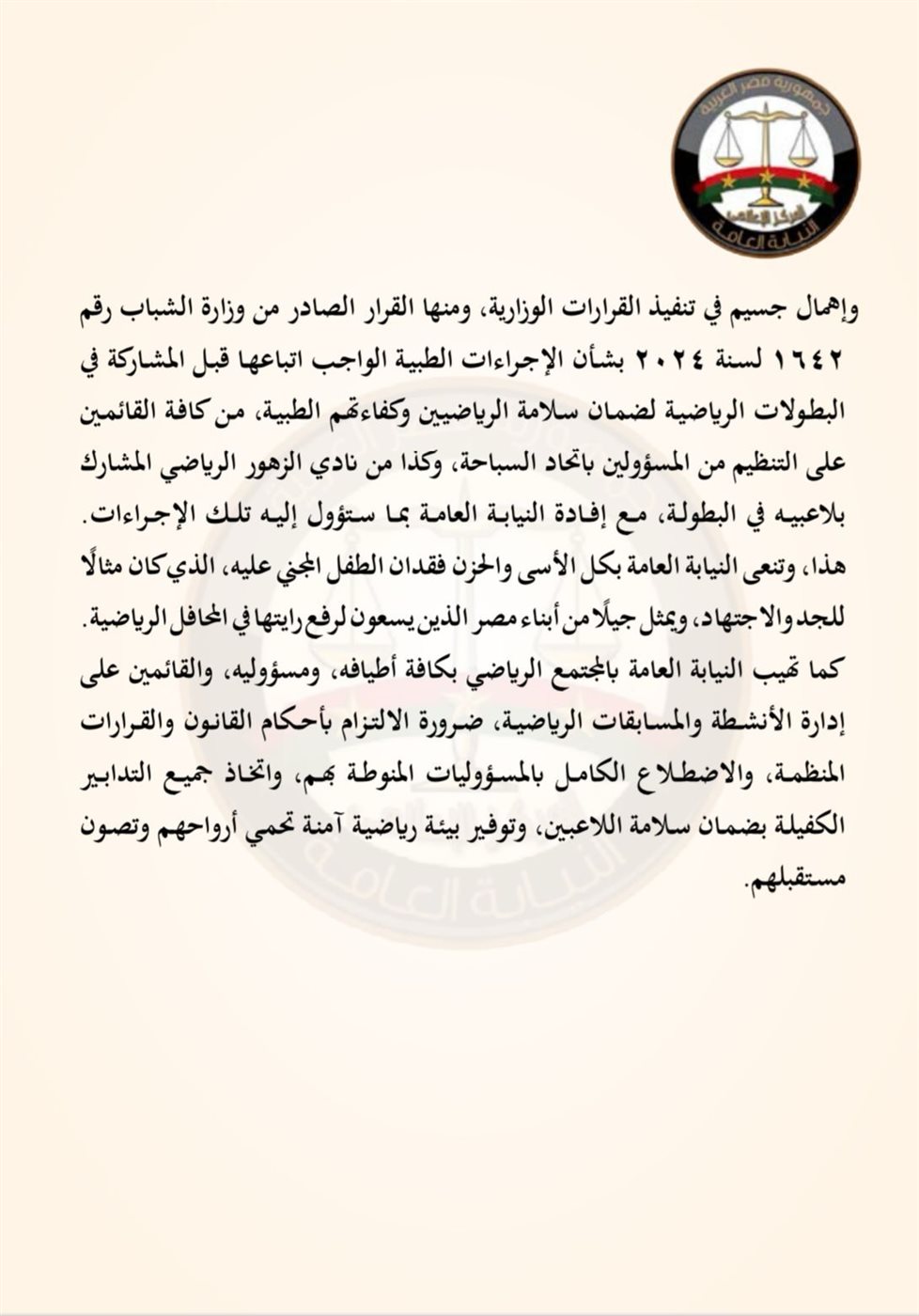 واختتمت النيابة بيانها بنعي الطفل البطل "يوسف"، مؤكدة أنه كان مثالًا للتفوق والاجتهاد، ودعت جميع الجهات الرياضية إلى الالتزام بالقانون، وتحمل مسؤولياتها كاملة، وتوفير بيئة آمنة تصون أرواح اللاعبين ومستقبلهم.