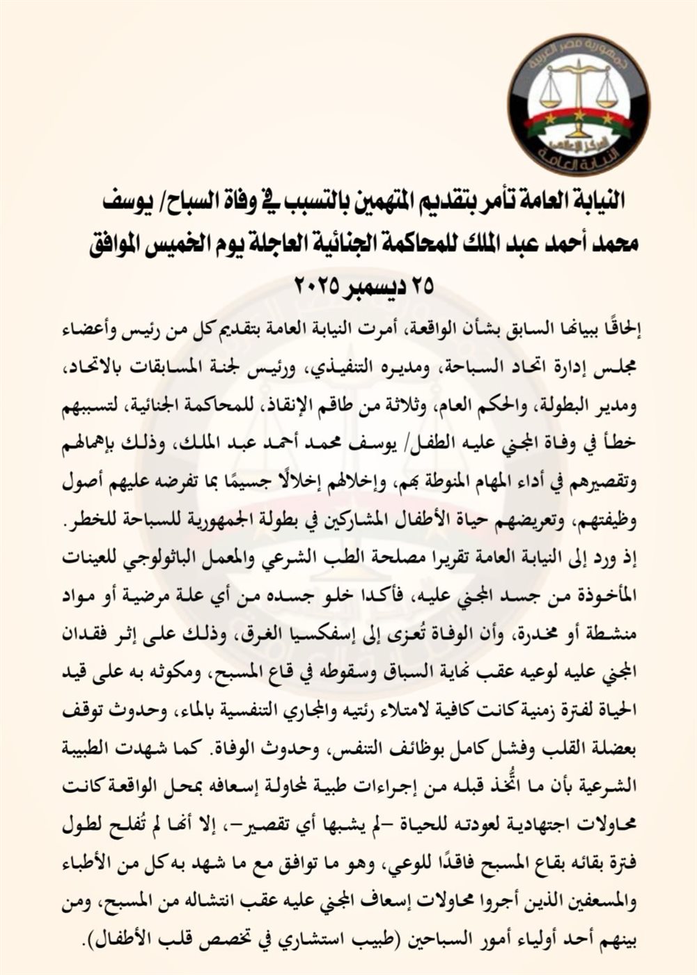 أمرت النيابة العامة، اليوم الخميس الموافق 25 ديسمبر 2025، بإحالة المتهمين بالتسبب خطأ في وفاة السباح الطفل يوسف محمد أحمد عبد الملك إلى المحاكمة الجنائية العاجلة، وذلك استنادًا إلى ما كشفت عنه التحقيقات من إهمال جسيم وتقاعس عن أداء المهام الوظيفية خلال بطولة الجمهورية للسباحة.