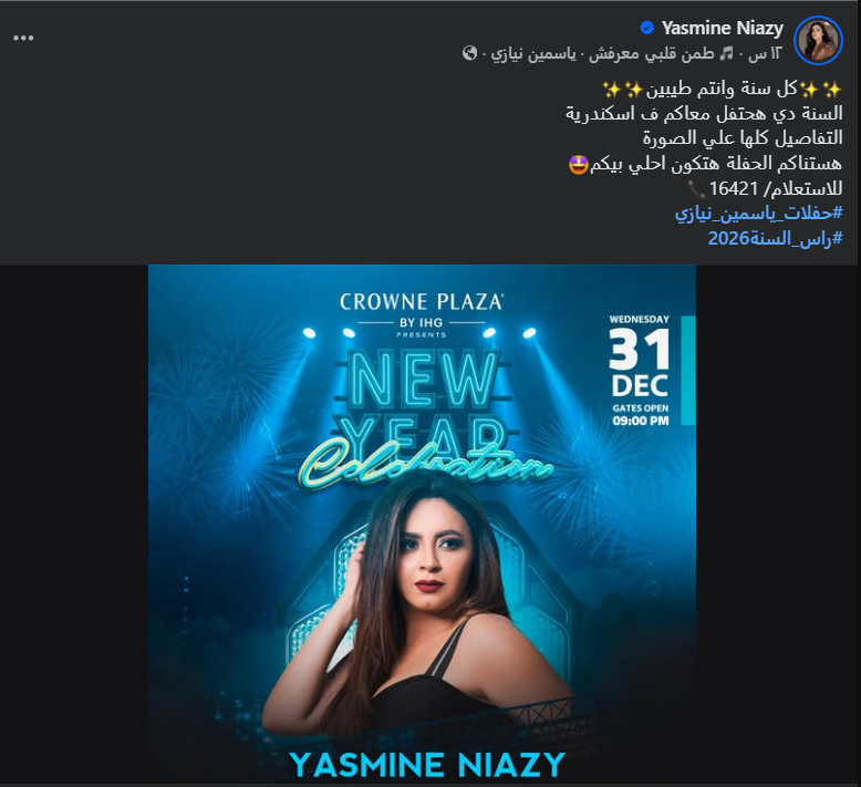 وكتبت:"كل سنة وأنتم طيبين،السنة دي هحتفل معاكم في إسكندرية، التفاصيل كلها على الصورة، هستناكم، الحفلة هتكون أحلى بيكم "، وأرفقت رقم الاستعلام عن الحفل:مستخدمة هاشتاجات #حفلات_ياسمين_نيازي و#راس_السنة2026.
