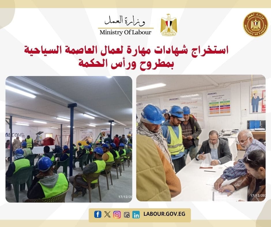 واصلت مديرية عمل مطروح، بإشراف مصطفى جابر، استخراج شهادات قياس مستوى المهارة وتراخيص مزاولة الحرفة للعمالة غير المنتظمة بمشروعات الساحل الشمالي ومطار رأس الحكمة بالتعاون مع شركات (أوراسكوم وريدكون).