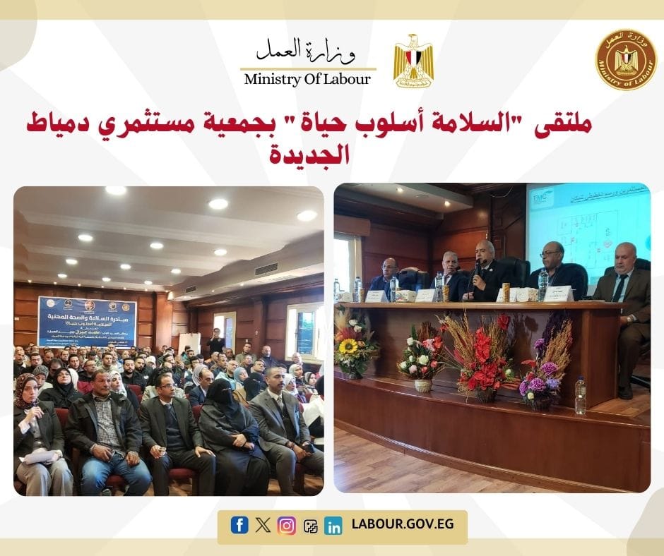 كما نظمت مديرية عمل دمياط، برئاسة فتحي التلاوي، ملتقى للسلامة والصحة المهنية بحضور ممثلي 70 شركة.